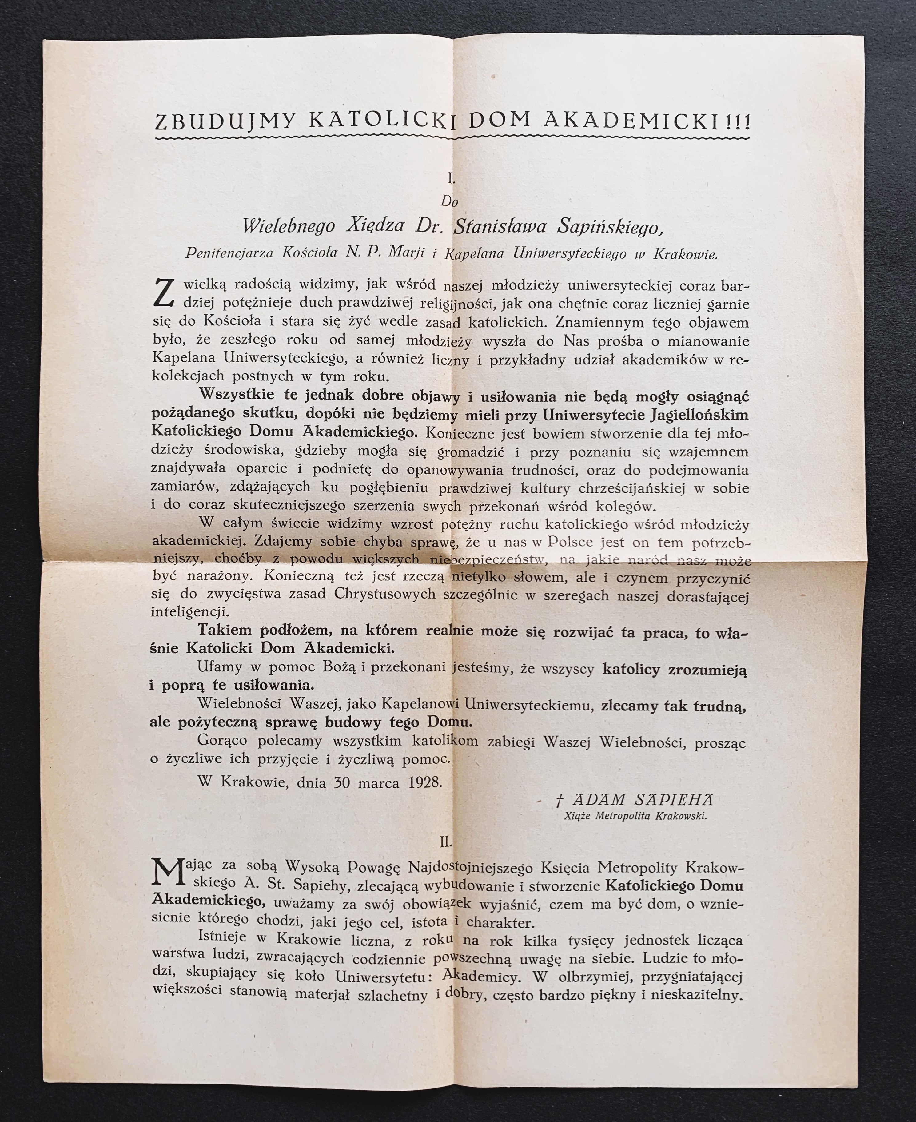 Ulotka zawierająca wymianę listów pomiędzy Xiąże Metropolity Krakowskiego Adama Sapiehy oraz Wielebnego Xiędza Dr. Stanisława Sapisńkiego o konieczności stworzenia na Uniwerystecie Jagiellońskim Katolickiego Domu Akademickiego.
