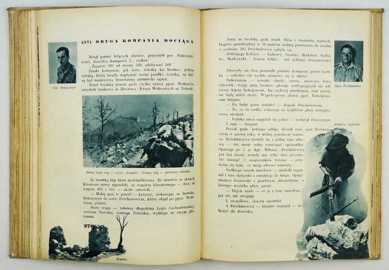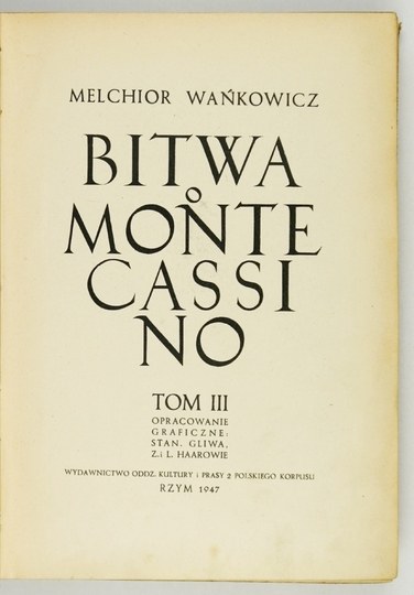Polonica 17900. Brak obwolut, t. 1 przeoprawiony (wyklejki nowe), uszkodzenia jednej karty w t. 1 (s. 313/314), niewielkie zabrudzenia. Podpis własn. w t. 2. T. 1 i 3 opracował graficznie Stanisław Gliwa (G. Herling-Grudziński pisał: "Czujna i troskliwa opieka tego grafika czyni zeń właściwie współautora książki Wańkowicza"). Stroną graficzną t. 2 zajęli się Zygmunt i Leopold Haarowie. Blisko 2.000 ilustracji, indeks nazwisk. Pierwsze wydanie najważniejszego dzieła M. Wańkowicza (1892-1974) - pisarza, reportażysty, publicysty, jednej z najbardziej oryginalnych indywidualności w literaturze polskiej XX w. W czasie walk we Włoszech pracował jako korespondent wojenny przy II Korpusie Polskim gen. Andersa i był świadkiem i uczestnikiem opisywanych przez siebie wydarzeń. Książka, utrwalająca legendę bitwy o Monte Cassino, jest klasyczną pozycją w dziedzinie reportażu wojennego. Obszerną relację z bitwy i okresu ją poprzedzającego zdobi niemal 2.000 zdjęć, szkiców, map i fotomontaży. W kraju książka Wańkowicza ukazała się dopiero w 1957, jednak w bardzo okrojonej przez cenzurę formie. Zachowana dołączana, za zgodą Wańkowicza, ośmiostronicowa broszura gen. K. Wiśniowskiego, szefa sztabu 2 Korpusu, "Uwagi do książki Melchiora Wańkowicza [...]", dotycząca boju o Piedimonte.