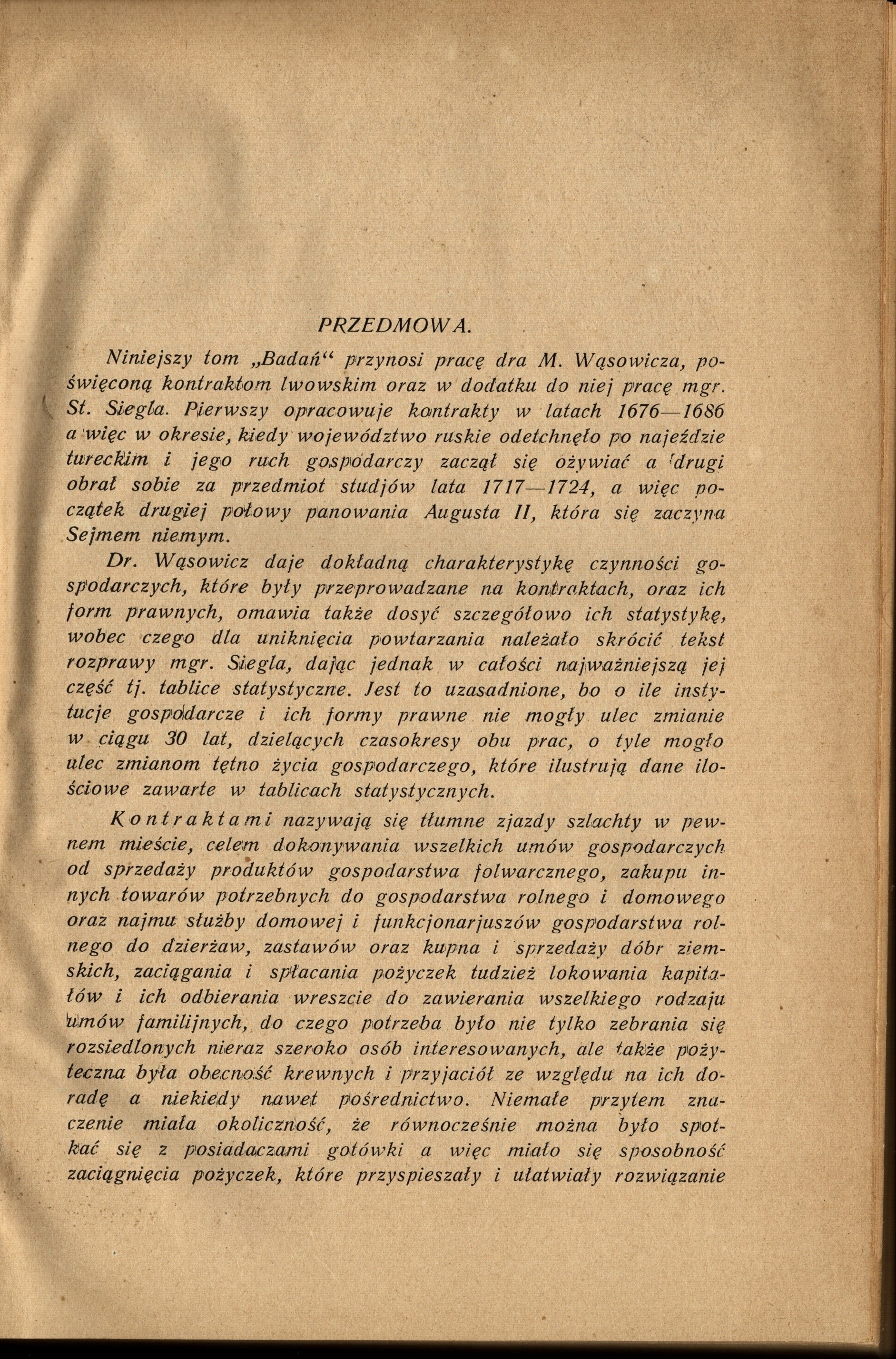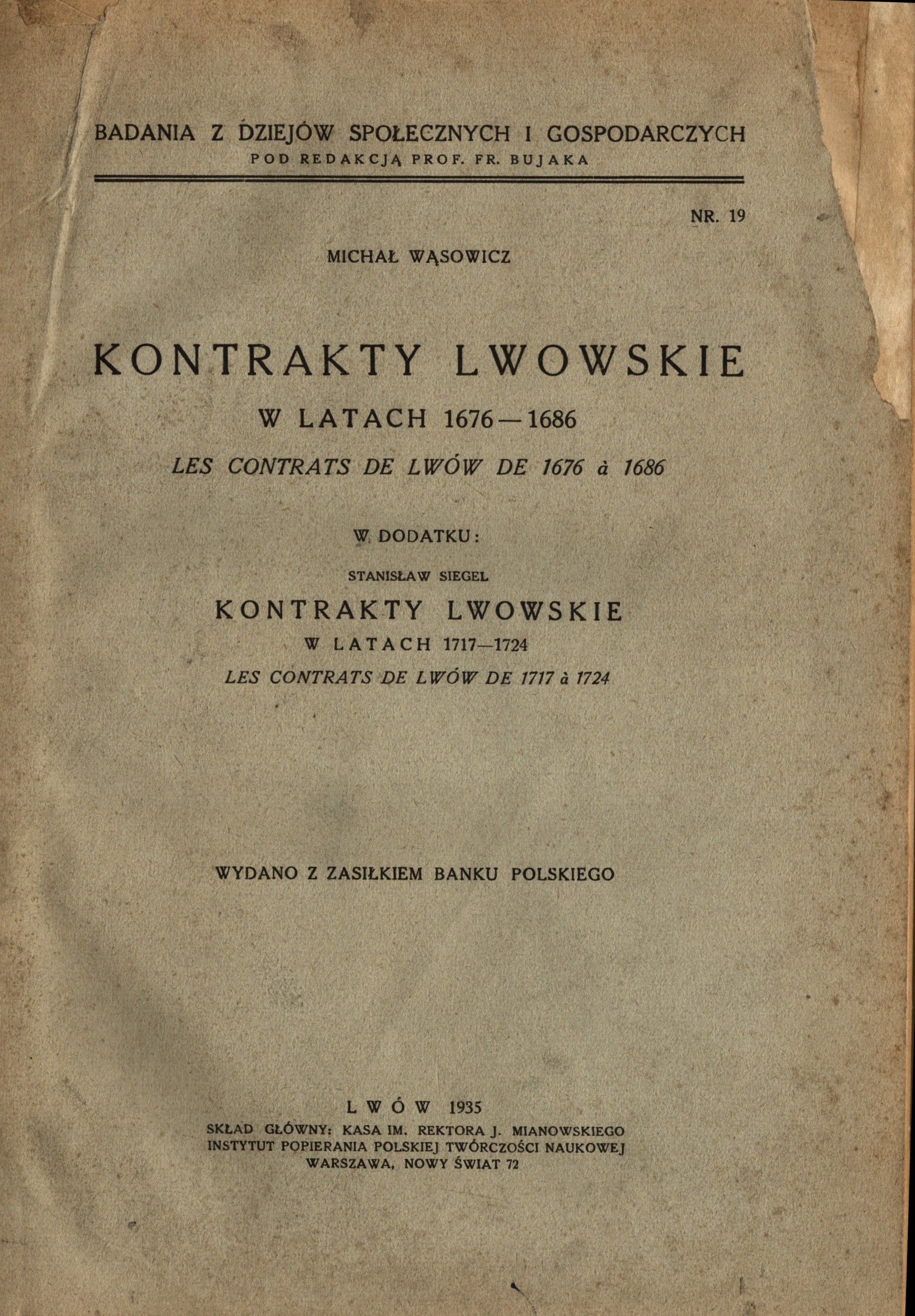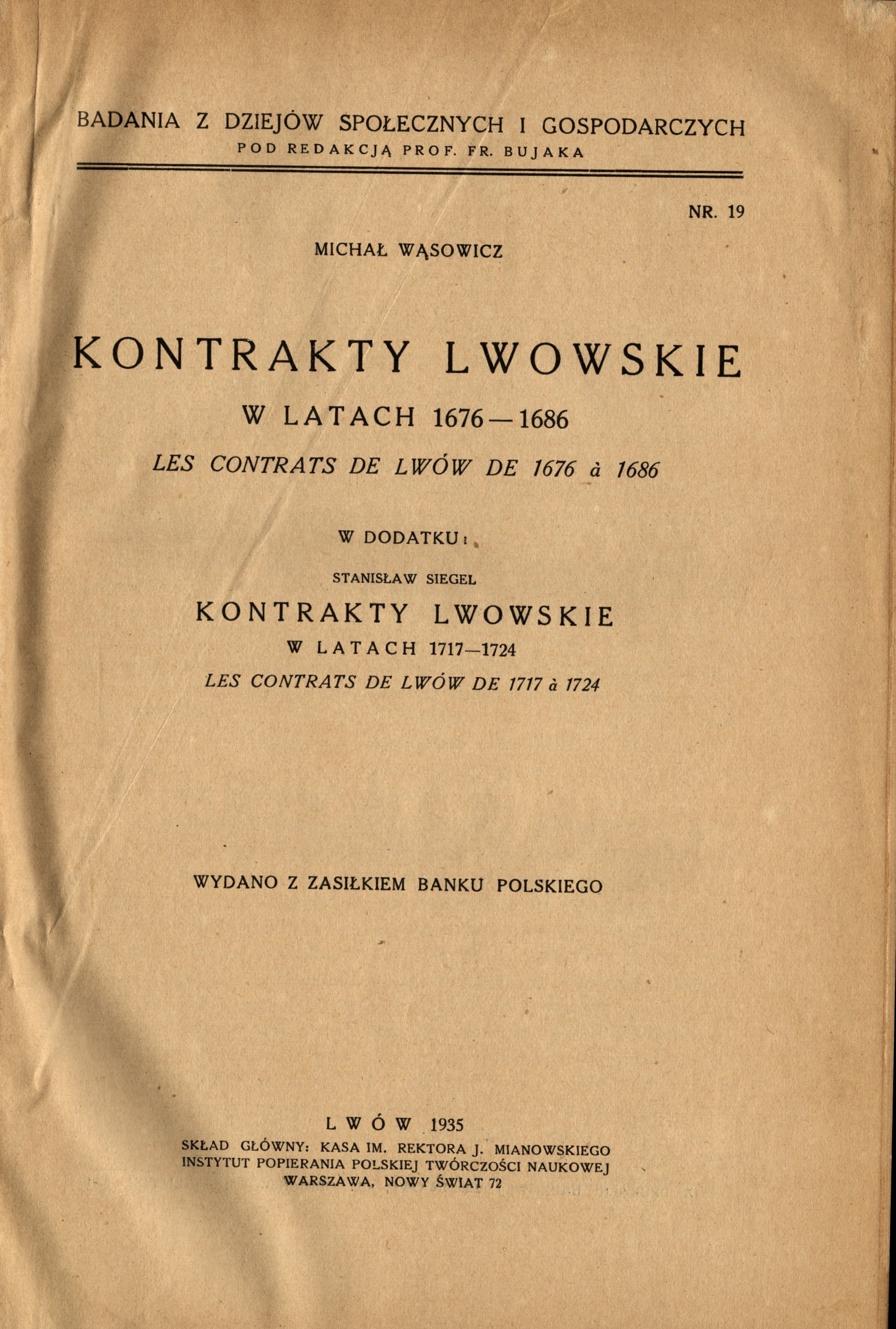 WĄSOWICZ Michał - Kotrakty Lwowskie w latach 1676-1686 [oraz] SIEGEL Stanisław - Kontrakty Lwowskie w latach 1717-1724. Lwów 1935.