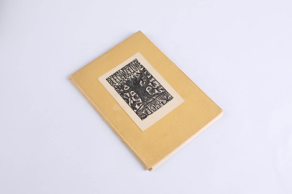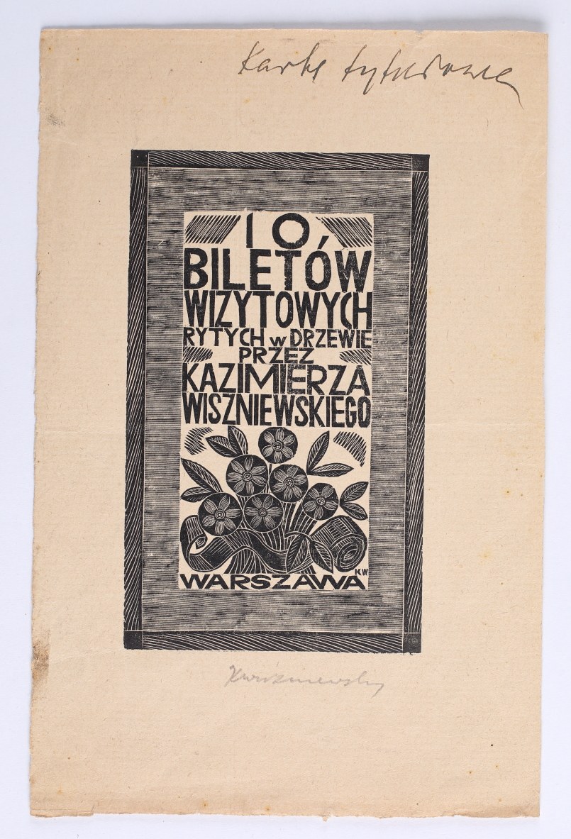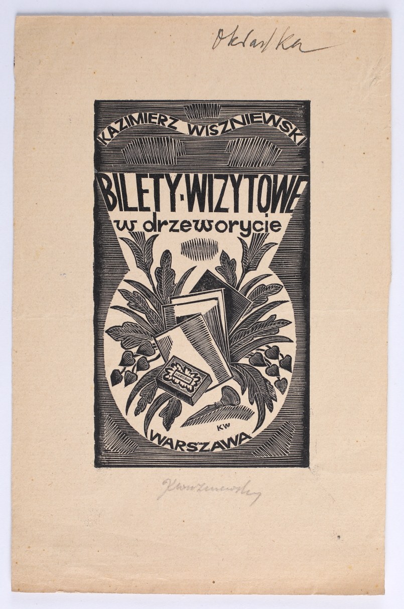 Dołączono również 2 oryg. drzeworyty z winietami okładkowymi oraz tytułowymi dla teki: K. Wiszniewski - "Bilety wizytowe w drzeworycie" (Szamotuły 1946). Wym. 20 x 13 cm każdy. Z odręcznymi adnotacjami autora.