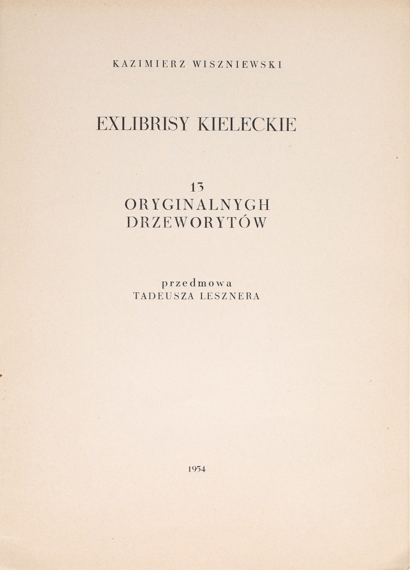 WISZNIEWSKI Kazimierz - Exlibrisy kieleckie. 13 oryginalnych drzeworytów. Przedmowa Tadeusza Lesznera. Kraków 1954 [dołączono 2 listy K. Wiszniewskiego do J. Chudka z lat 1955/56]