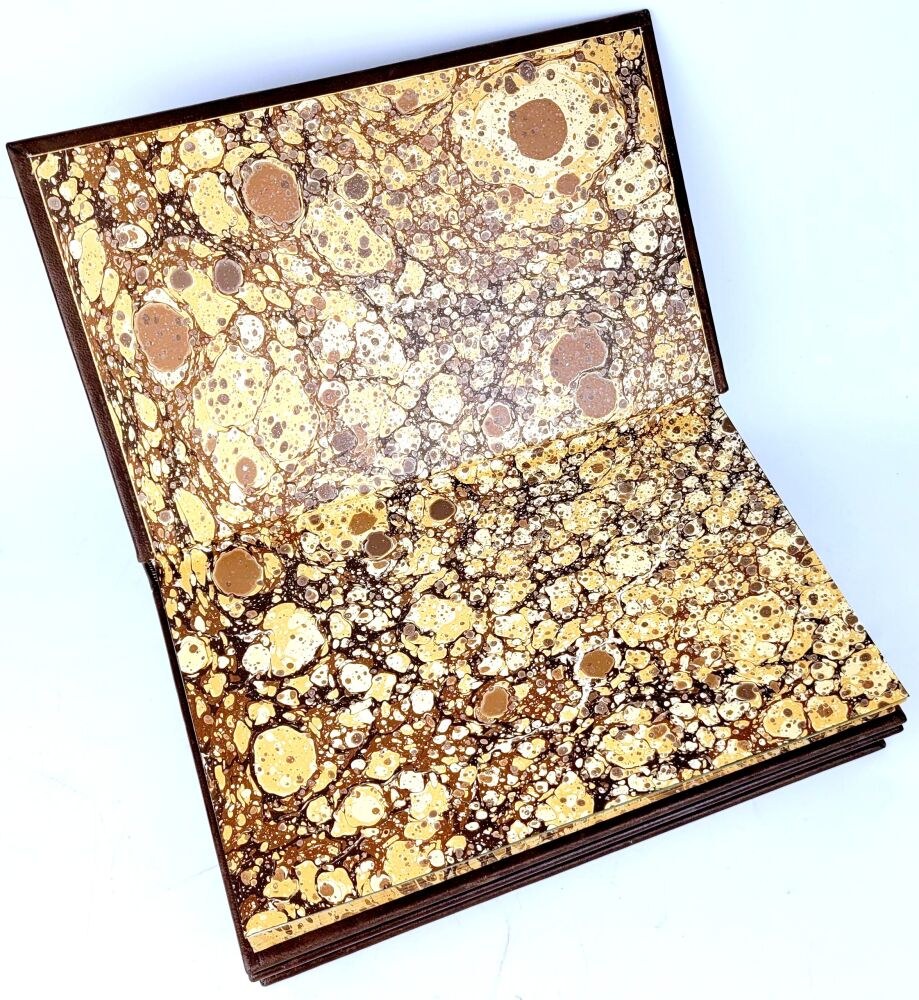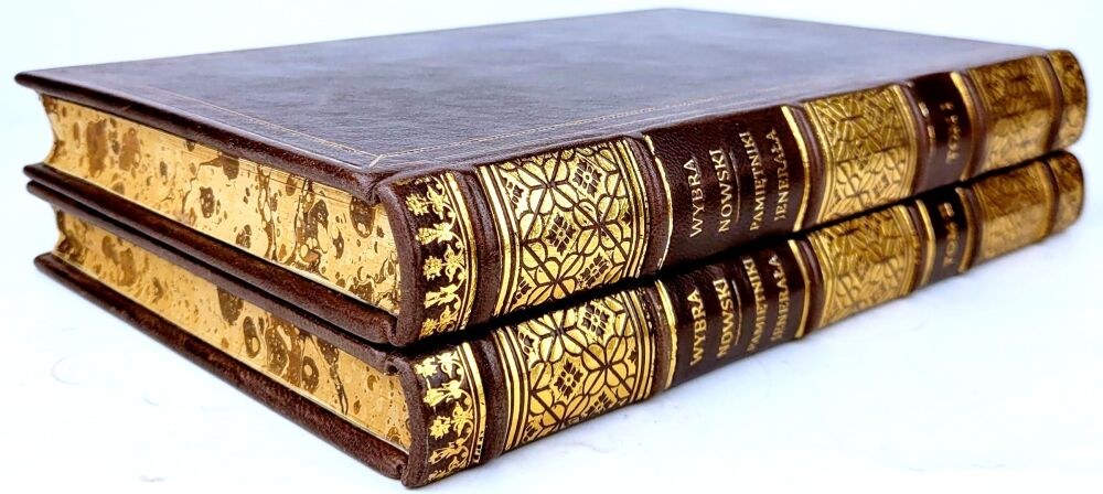 TWARDA OPRAWA PEŁNA SKÓRA WSPÓŁCZESNA. OKŁADKI OKOLONE MISTERNĄ ZŁOCONĄ BORDIURĄ. GRZBIETY Z WYPUKŁYMI ZWIĘZAMI, TŁOCZENIAMI I ZŁOCENIAMI. WYKLEJKI MARMORYZOWANE, OBCIĘCIA KART MARMORYZOWANE TYM SAMYM WZOREM. WNĘTRZA OKŁADEK WYKOŃCZONE MISTERNĄ ROLKĄ. ZACHOWANE OKŁADKI WYDAWNICZE OBU TOMÓW.