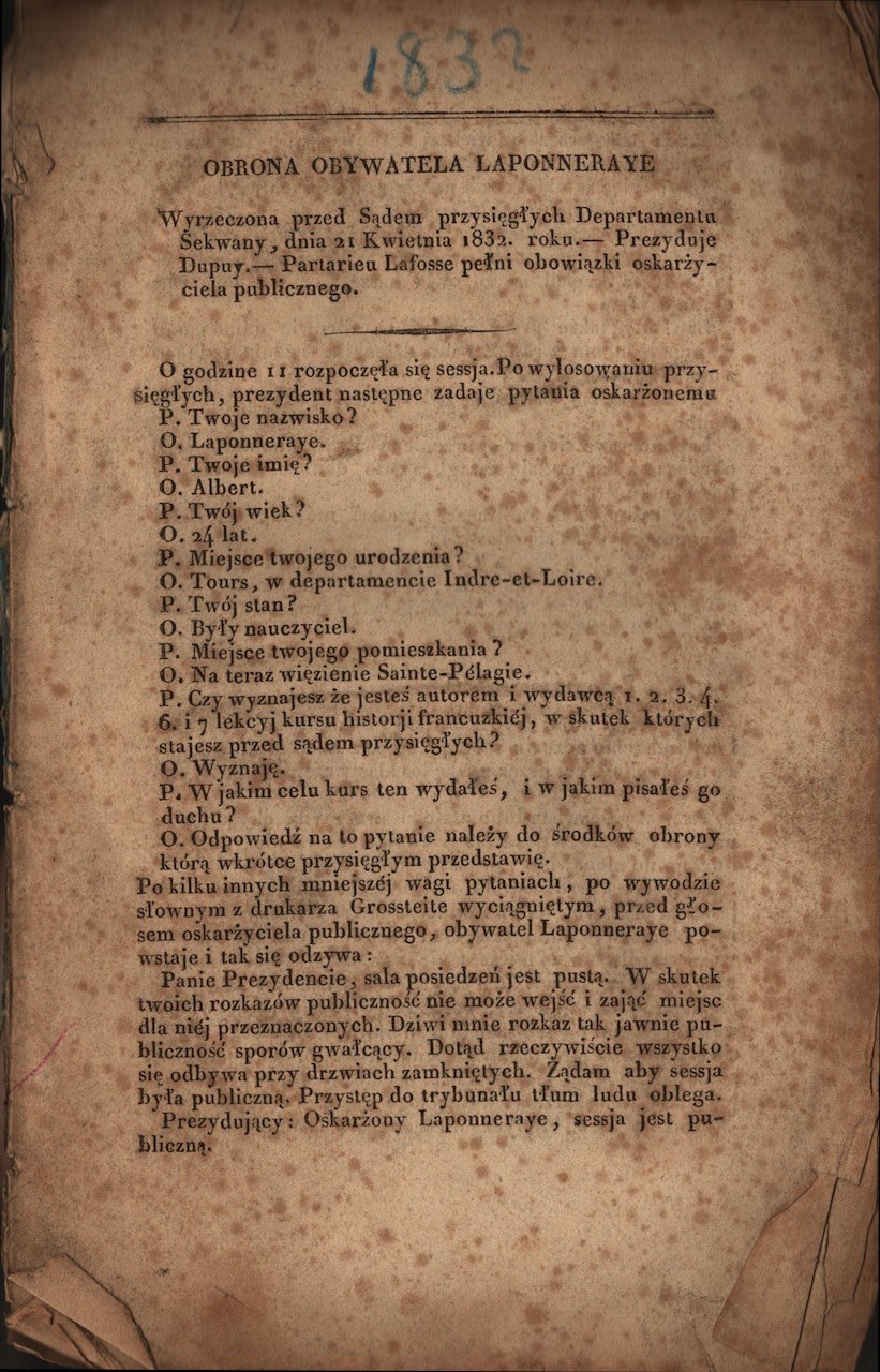 Socjalizm] Obrona obywatela Laponneraye : wyrzeczona przed Sądem przysięgłych Departamentu Sekwany, dnia 21 Kwietnia 1832 [b. m. oraz d. wyd. Paryż?, nie przed 1832]