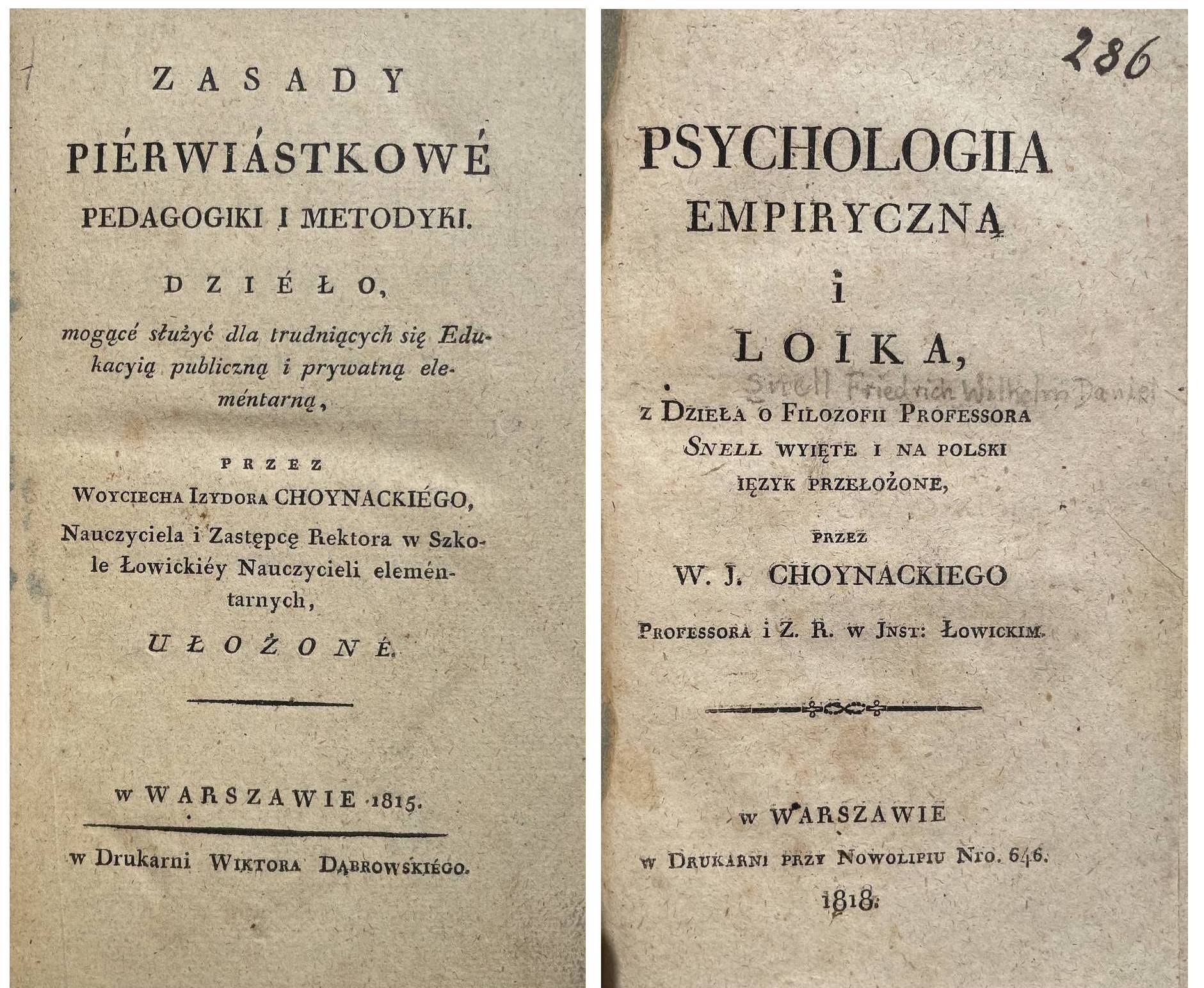 Choynacki Woyciech Izydor, Zasady pierwiastkowe pedagogiki i metodyki. Dzieło mogące służyć dla trudniących się Edukacyią publiczną i prywatną elementarną. Warszawa 1815, w Druk. W. Dąbrowskiego oraz : Snell Friedrich W.D., Psychologiia empiryczna i loika. Warszawa 1818, w Druk. Przy Nowolipiu. 19 cm, str. 141, [1]; 184. Oprawa z epoki płsk. z szyldem na grzb., stan b. dobry, ładny egz. Księgozbiór z Małej Wsi. Rzadkie !