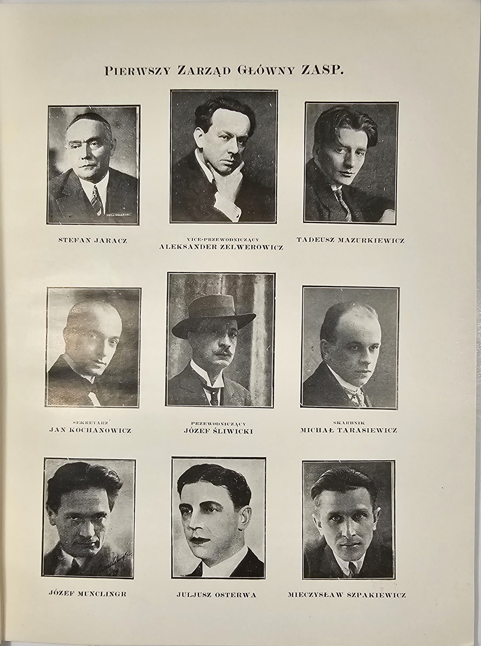 24 cm, s. 51, ilustr., okł. oryg. sygn.[Tadeusz]Gronowski 29. Stan dobry. Zawiera: Zagórski Adam - Czego dokonał aktor polski w pierwszem dziesięcioleciu swej organizacyjnej działalności. Wykaz członków honorowych z fotografiami, Pierwszy Zarząd Gł. ZASP z fotografiami, Obecny Zarząd Główny z fotografiami, résumé w j. franc.