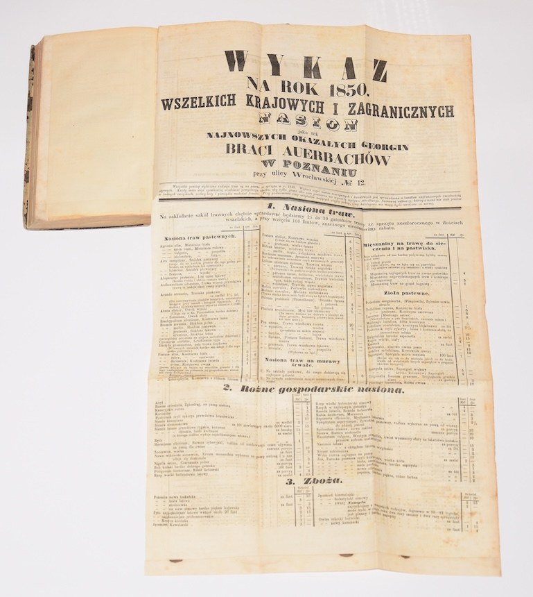 Po tekście UNIKATOWY ! rozkł. "Wykaz na rok 1850 wszelich krajowych i zagranicznych nasion jako też najnowszych okazałych Georgin Braci Auerbachów w Poznaniu przy ulicy Wrocławskiej No 12".