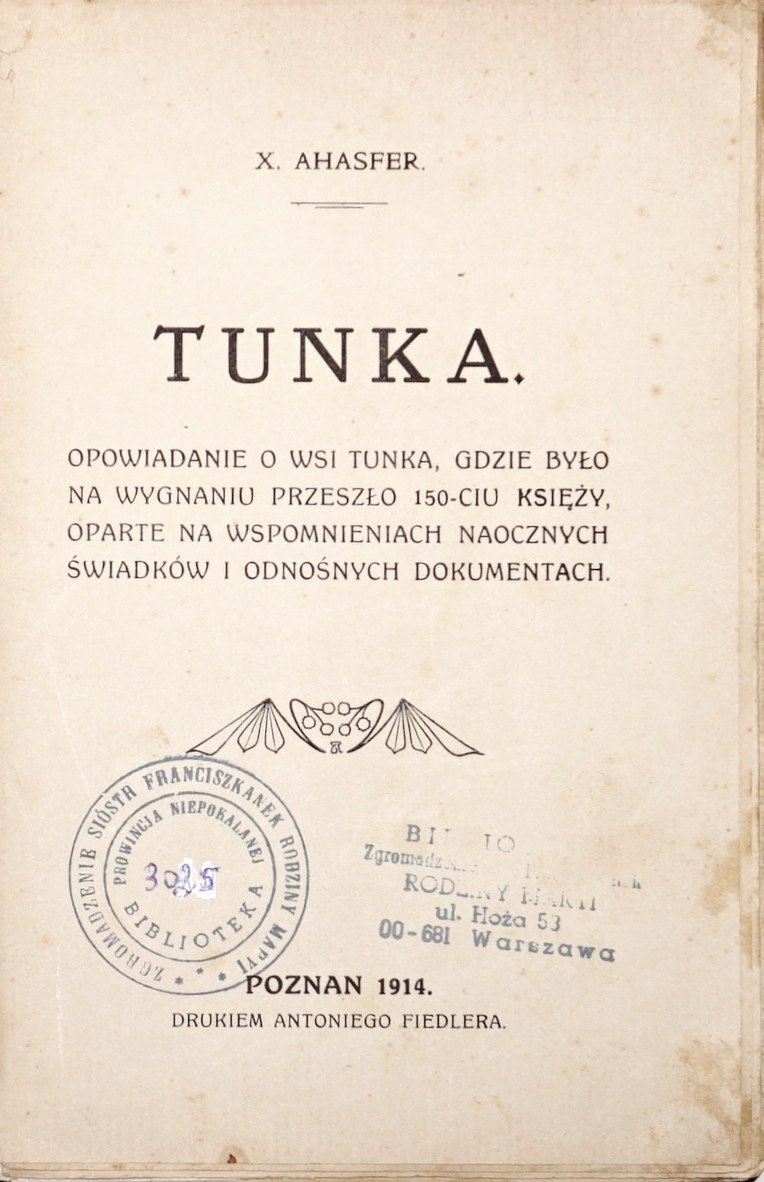 Tunka, opowiadanie o wsi Tunka, gdzie było na wygnaniu przeszło 150-ciu księży, oparte na wspomnieniach naocznych świadków i odnośnych dokumentach / X. Ahasfer.