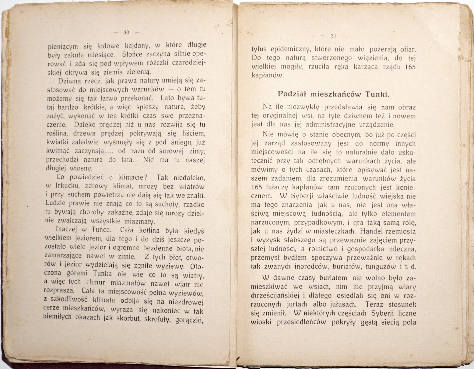 Opis życia zesłańców polskich we wsi Tunka we wschodniej Syberii, gdzie pod koniec zsyłki przebywał od 1890 r. Józef Piłsudski. Spis księży zesłanych do Tunki.