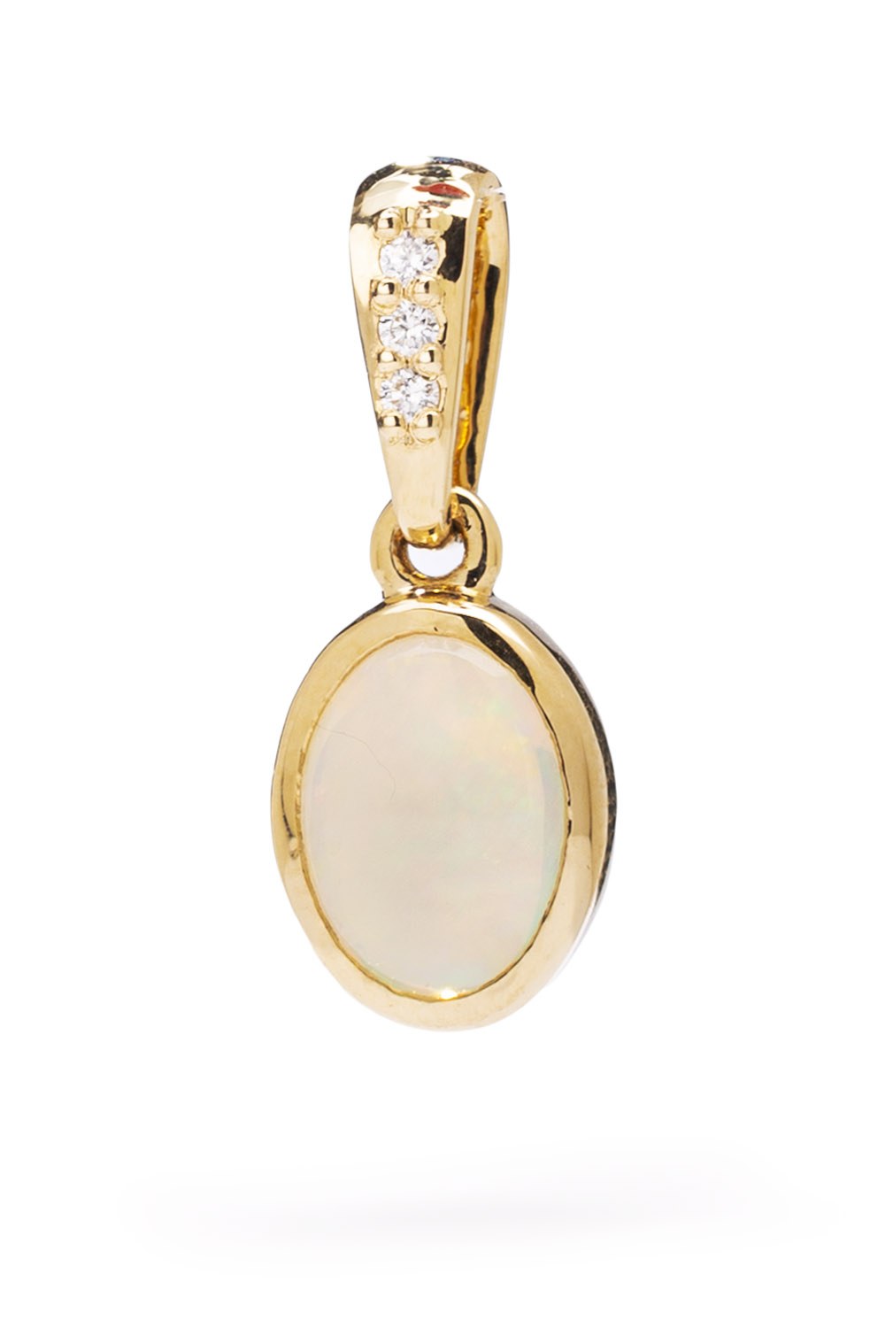 złoto pr.~ 0,585, 1 biały opal australijski owal- kaboszon ~ 1,00 ct wym.: 8 x 6 mm, 3 diamenty ł. ~ 0,03 ct D-E/VVS-VS, krakowska punca probiercza, złotnik 'PT' - Piotr Tomaszewski, masa: 1,20 g, wym.: 1,7 x 0,7 cm
