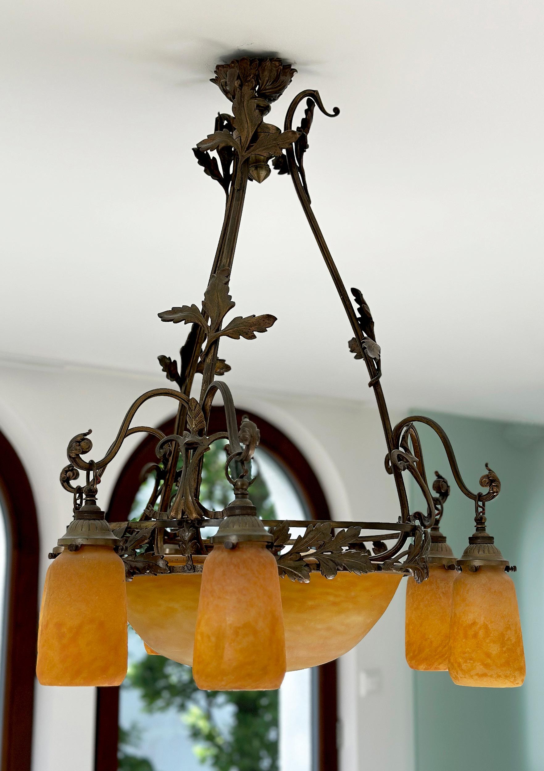 Glaskörper mit orangenen Pulvereinschmelzungen an geschmiedetem Eisengestell. Dieses mit vegetabilen Ornamenten zentral zusammenlaufend und ein Glaskugelsegment rahmend. (1402406) (13)