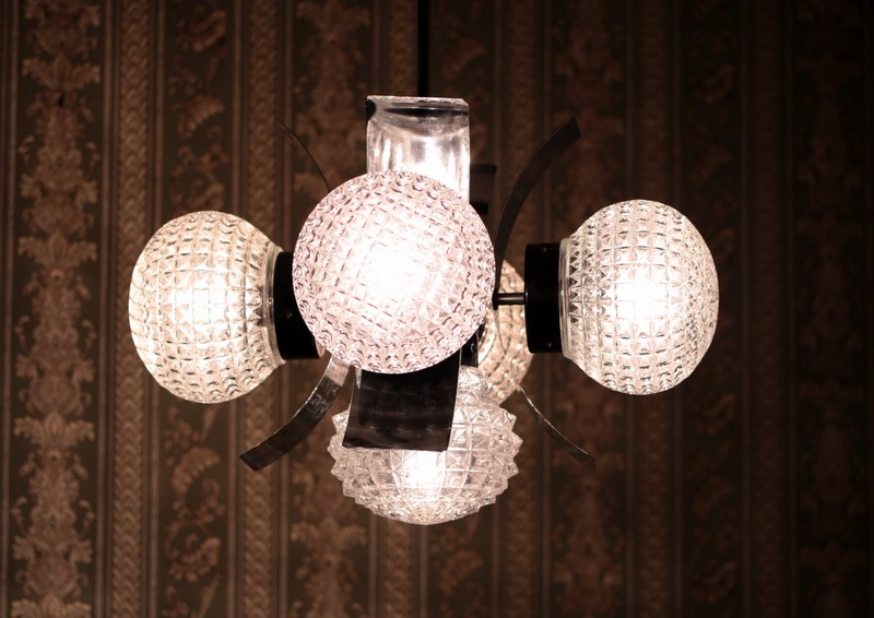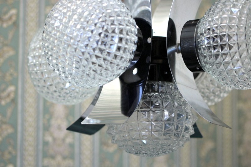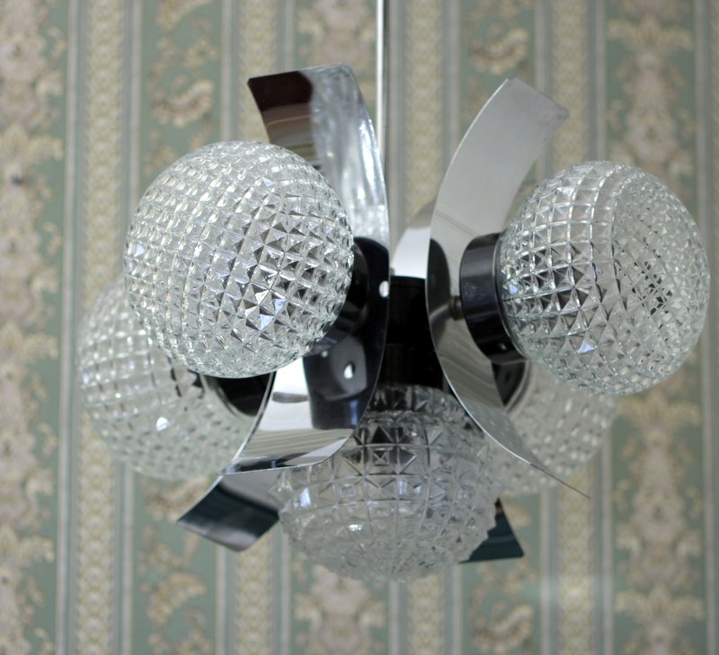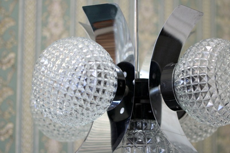 Lampa zwana potocznie ""Sputnik'' . Dekoracyjne chromowane elementy stanowią tło do pięknych