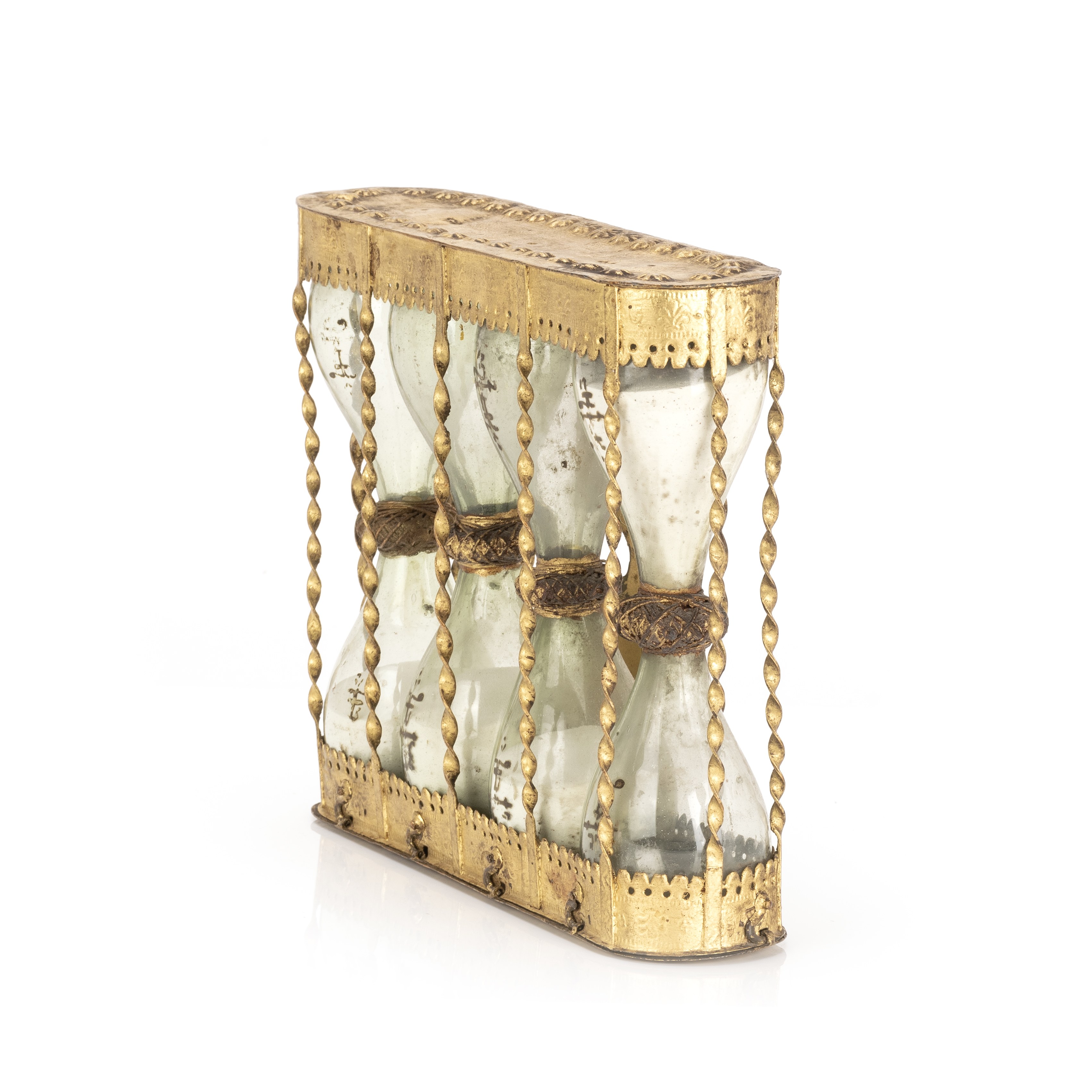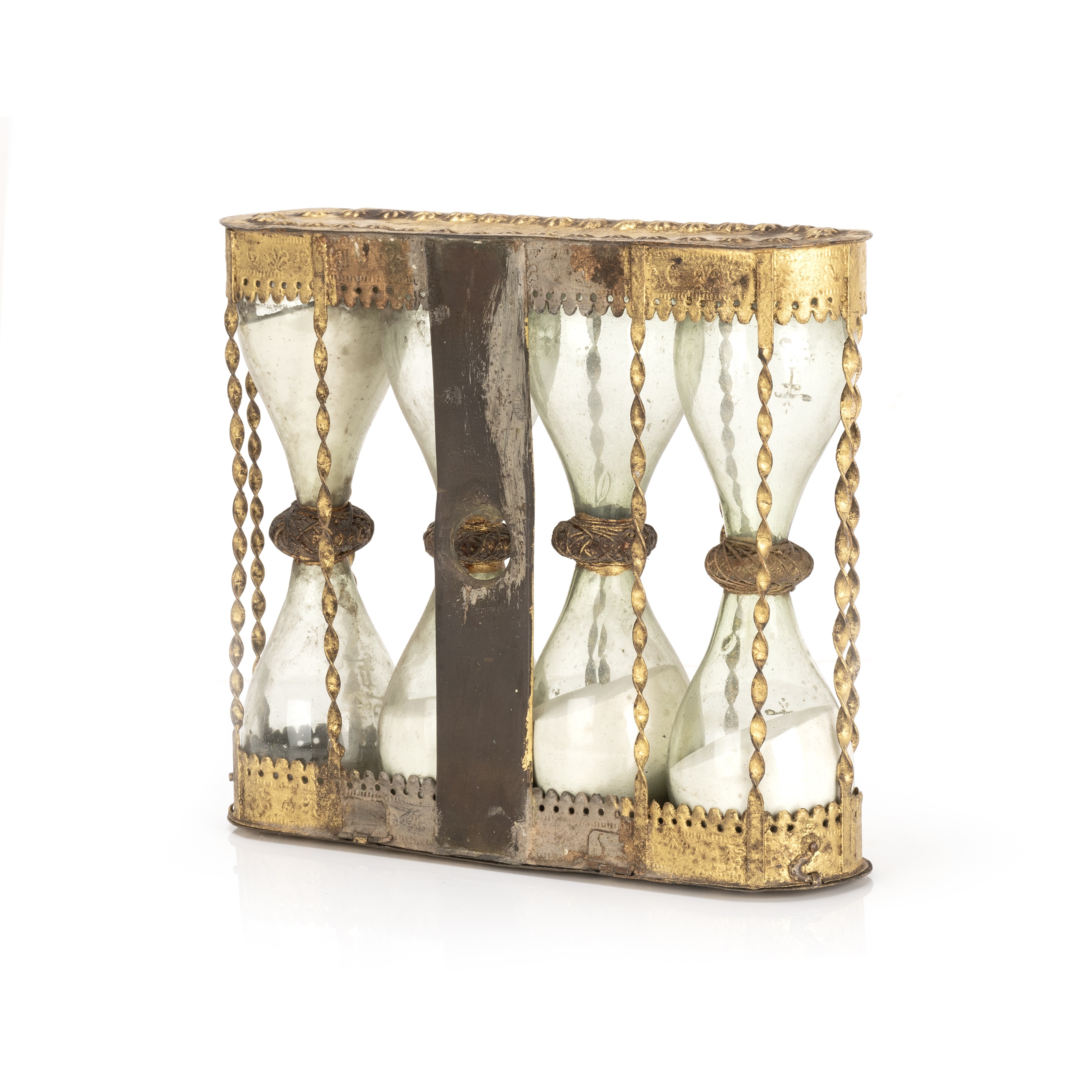 Deutschland, 18. Jh., Messing, getrieben, ziseliert und patiniert, Glas-Sanduhren mittig mit Karton und Schnur ummantelt, weißer Marmorsand, das Glas handbeschriftet, 18,5 x 22 cm, eine Sanduhr nicht funktionstüchtig, Alters- und Gebrauchsspuren. Typische drehbare barocke Kanzeluhr oder Predigtuhr, um die Dauer der Predigt vorzugeben. In der Regel enthielt das erste Glas Sand für eine Viertelstunde, das Zweite für eine Halbe Stunde, das Dritte für eine Dreiviertelstunde und das Vierte für eine volle Stunde.