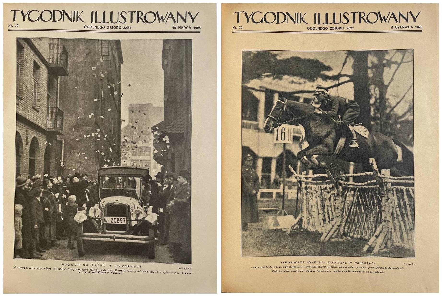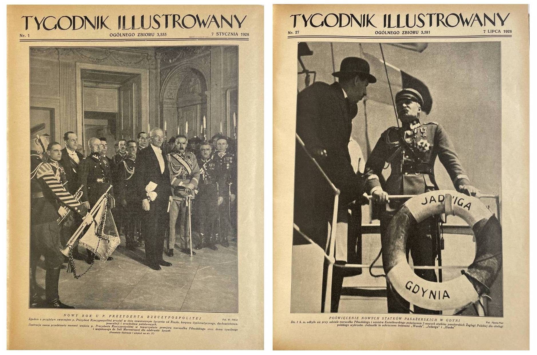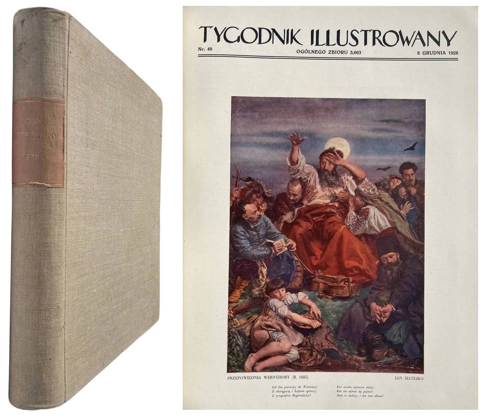 Tygodnik Illustrowany. Rok 1928 nr 1-52 (I i II półrocze). 38,5 cm, str. 972. Oprawa z epoki pł. z szyldem na grzb. W nr 1 i po str. 24 pomyłka w paginacji, brak 12 kart (ostatnie strony z reklamami) i spisu treści półrocza II. Stan bardzo dobry, ładny egz.