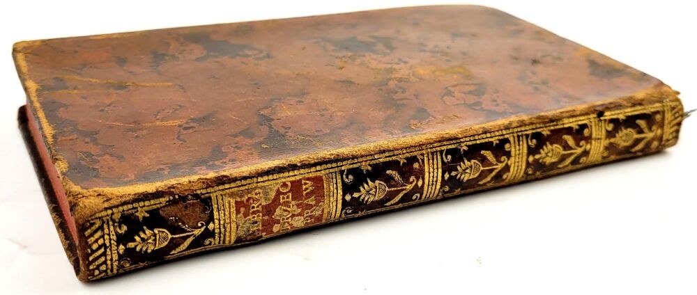 TWARDA OPRAWA PEŁNA SKÓRA MARMORYZOWANA Z EPOKI, DEKORACYJNY GRZBIET Z ZAGĘSZCZONYMI ZDOBIENIAMI ROŚLINNYMI I SZYLDZIKIEM. OBCIĘCIA KART BARWIONE. WYKLEJKI MARMORYZOWANE W WEPOCE.