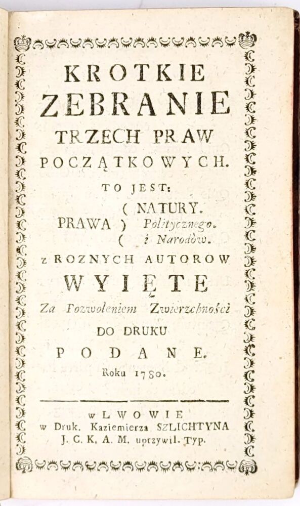 Lwów 1780, Druk. Kazimierza Szlichtyna, str. [4], 189, [5], format 10x15 cm