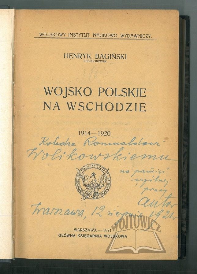 Niew. przetarcia opr. Ślady zażółceń stron. Stan dobry. Na k. tyt. odręczna dedyk. od Autora. W treści: Organizacja Legjonów Polskich w b. zaborze rosyjskim i działania bojowe 1-go Legjonu Puławskiego i 2-ch szwadronów ułanów. Brygada i Dywizja Strzelców Polskich (1915-1917). Pułk Ułanów Krechowieckich. Sprawa Wojska Polskiego i Zwiazek Wojsk. Polaków w Rosji. Korpusy Polskie. Wojsko Polskie na Murmanie, Syberji Kubaniu i Odesie. H. Bagiński (1888-1973), historyk wojskowości, inżynier, instruktor harcerski, harcmistrz, pułkownik dyplomowany saperów Wojska Polskiego, zastępca Komendanta Głównego Związku Walki Zbrojnej, szef Sztabu Komendy Głównej ZWZ.
