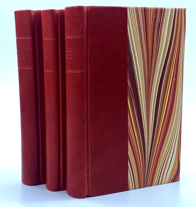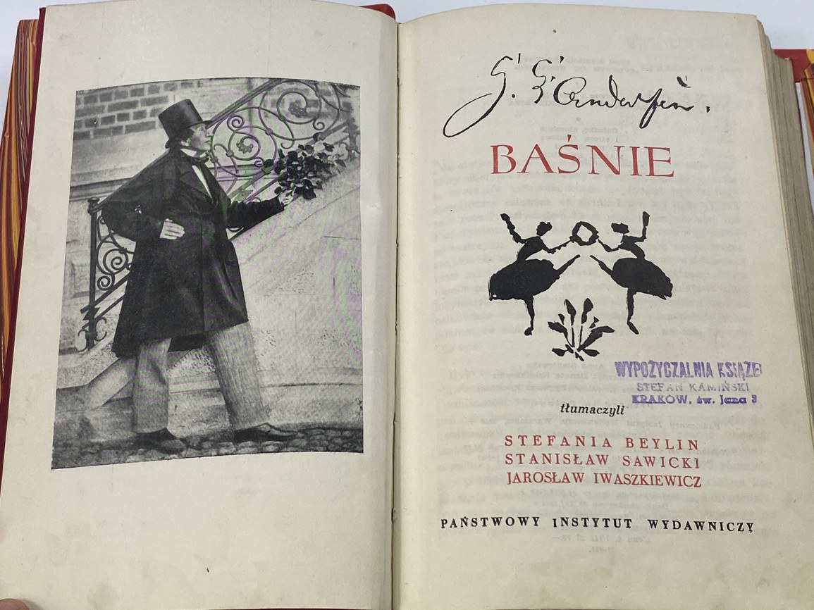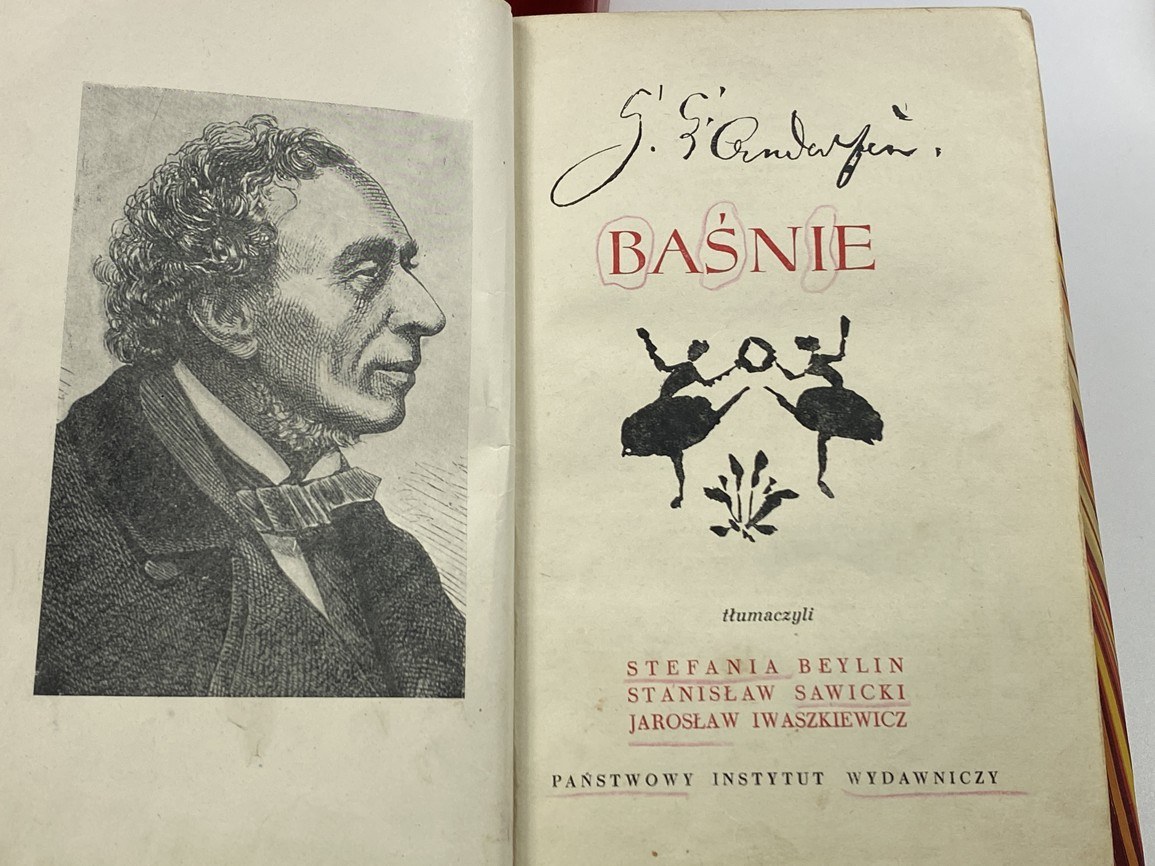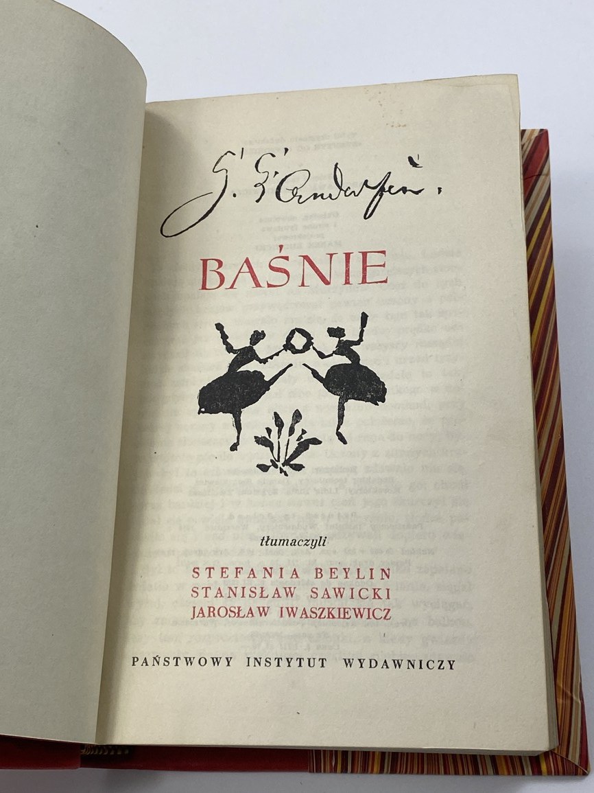Andersen Hans Christian, Baśnie. T. 1-3, Państwowy Instytut Wydawniczy, Warszawa 1956, s. 443, [1], [1] k. tabl.; 457, [1];459, [1], [1] k. tabl., wymiary 13 x 20,5 cm. Tłumaczenie Stefania Beylin, Stanisław Sawicki, Jarosław Iwaszkiewicz. T.1- niewielkie podkreślenia na stronie tyt., niewielkie zabrudzenia w środku, T.3- nieakt. pieczęć własności. Półskórki wykonane w pracowni Suszek Books.