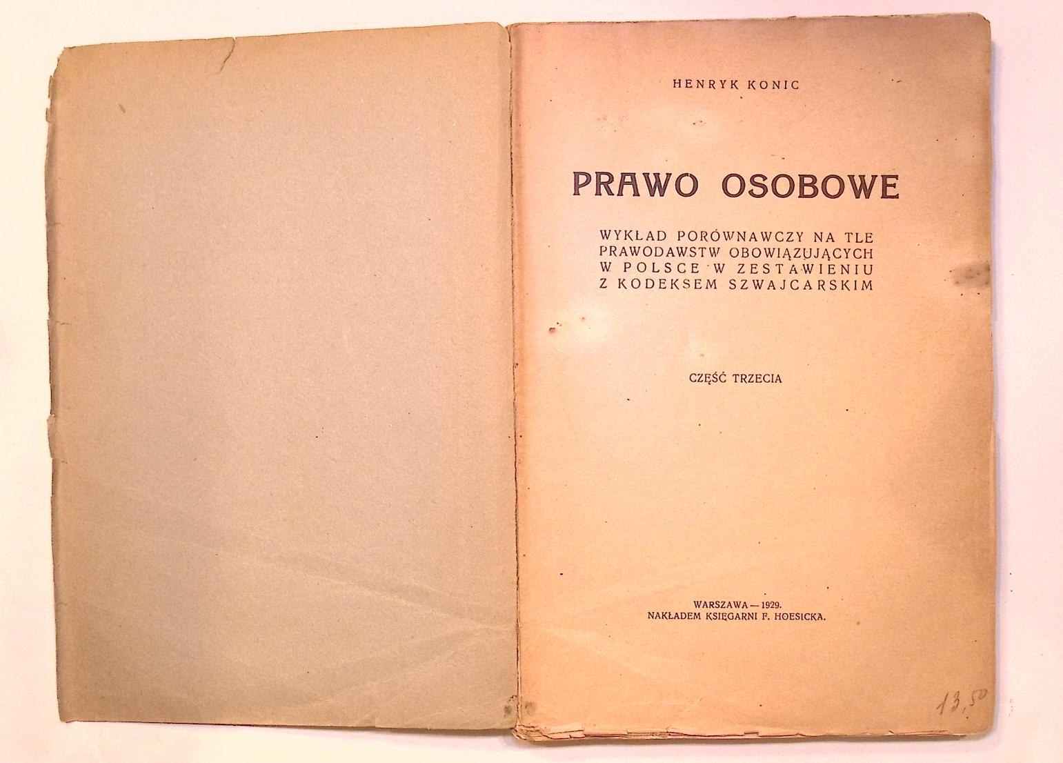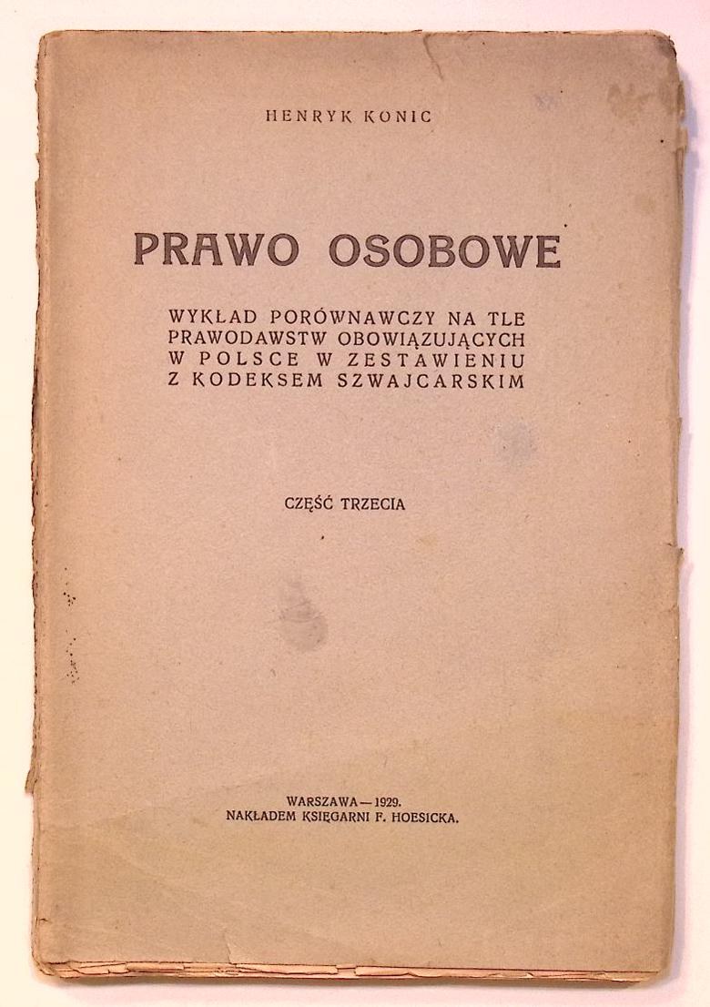 Henryk KONIC Prawo osobowe. Wykład porównawczy na tle prawodawstw w obowiązujących w Polsce w zestawieniu z kodeksem szwajcarskim. Część trzecia Warszawa 1929 Nakładem Księgarni F. Hoesicka [6], 428 s. s. db+ podniszczona okłdaka i niewielki ubytek marginesu ost str. For. ca: 24x16 cm |