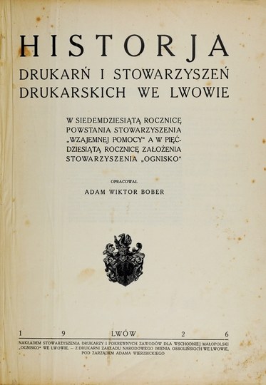 BOBER Adam Wiktor - Historja drukarń i stowarzyszeń drukarskich we Lwowie. W siedemdziesiątą rocznicę powstania Stowarzyszenia "Wzajemnej Pomocy" [...]. Oprac. ... Lwów 1926. Stow. Drukarzy i Pokrewnych Zawodów dla Wschodniej Małopolski "Ognisko". 4, s. [4], 242, [2], tabl. 17. opr. oryg. pł. złoc.