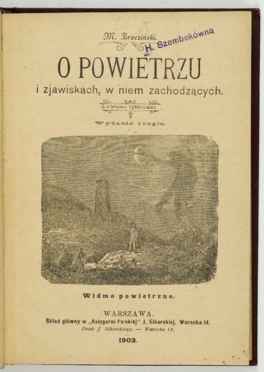 BRZEZIŃSKI M[ichał] - O powietrzu i zjawiskach w niem zachodzących. Z wieloma rysunkami. Wyd. II. Warszawa 1903. Skł. gł. w "Księgarni polskiej" J. Sikorskiej. 16d, s. 184. opr. pł. zdob. z epoki.