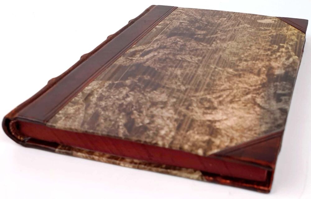 TWARDA OPRAWA PÓŁSKÓREK WSPÓŁCZESNY, GRZBIET Z WYPUKŁYMI ZWIĘZAMI, TŁOCZENIAMI I ZŁOCENIAMI, OZDOBNY PAPIER MARURKOWY BARWIONY NA KARAGENIE NA OKŁADKACH, OBCIĘCIA KART BARWIONE