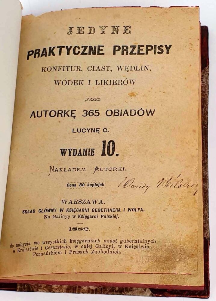 Warszawa 1882, skład główny u Gebethnera i Wolffa, na Galicyję w Księgarni Polskiej, do nabycia we wszystkich księgarniach Królestwa, Cesarstwa, Galicji, Księstwa Poznańskiego i Prus Zachodnich, str. X,262, format 13x19cm
