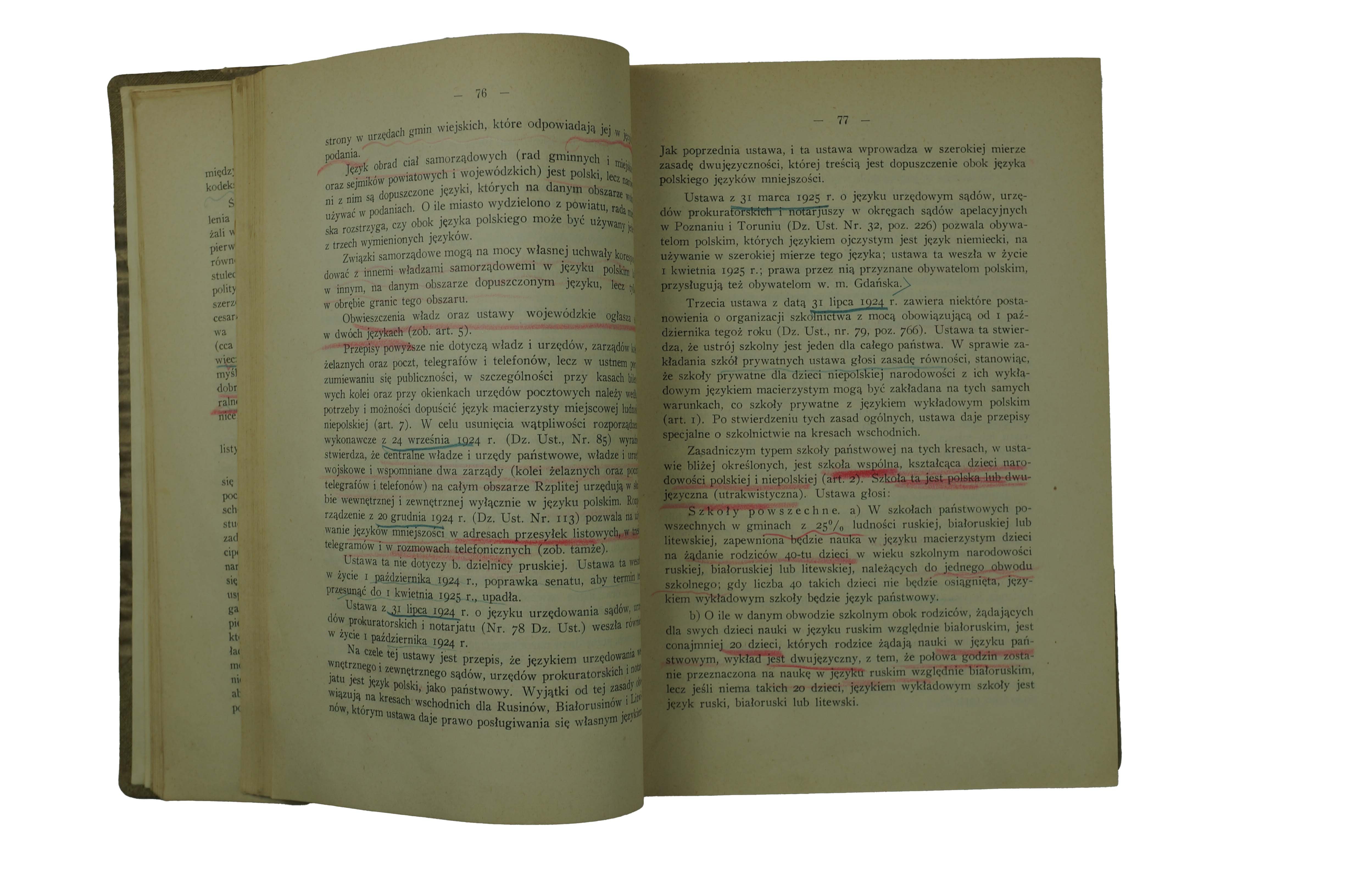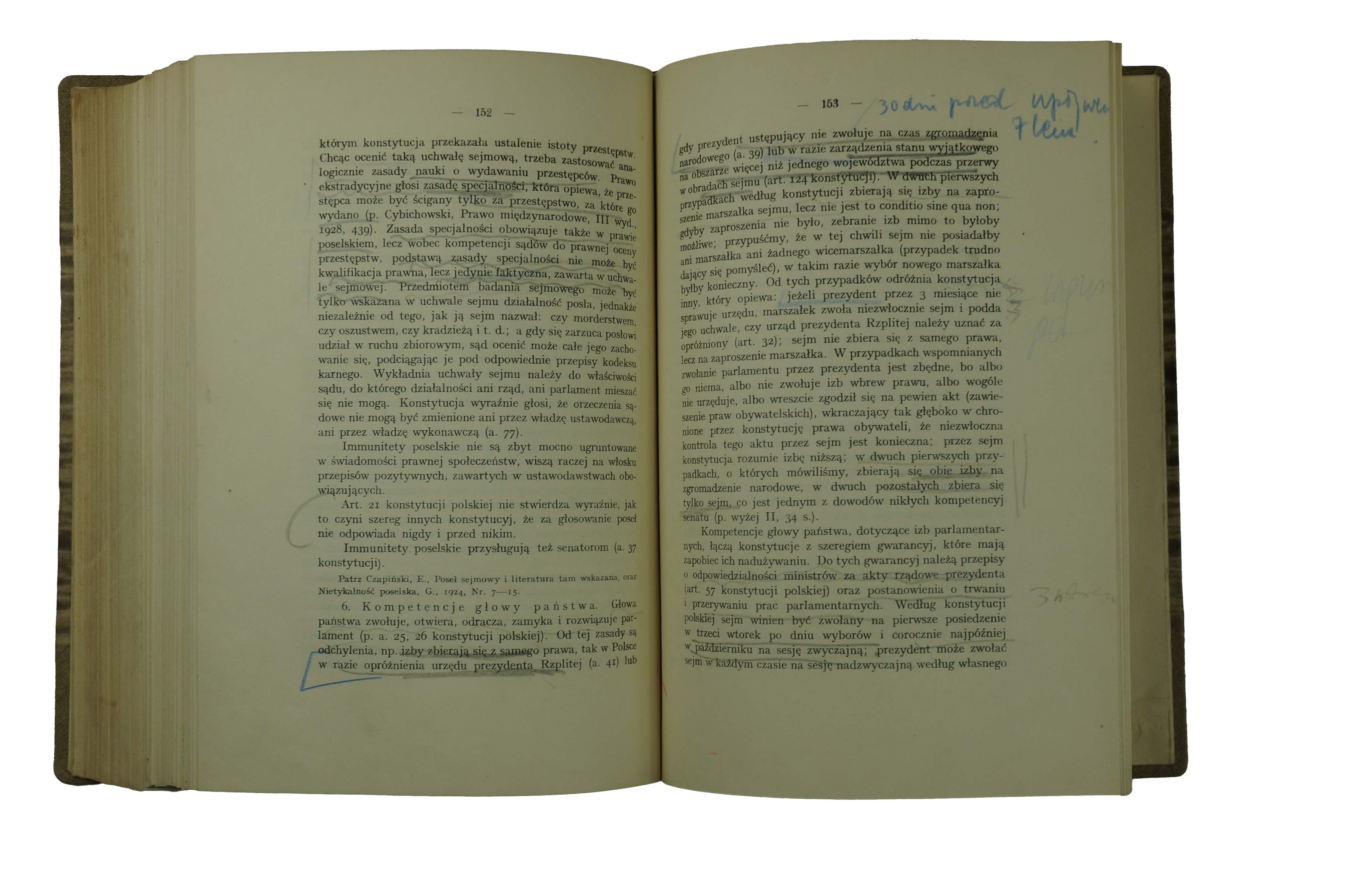 oprawa twarda, ppł. podpis z datą na stronie przedtytułowej, podkreślenia na stronie tytułowej, strona po tytułowa z przekreśleniami zapisków, liczne podkreślenia w tekście, ślady starego zacieku [[zaplamienia] na części stron części II, poza tym stan dobry