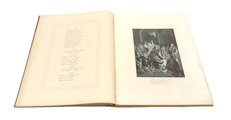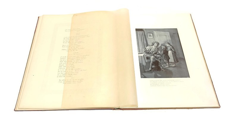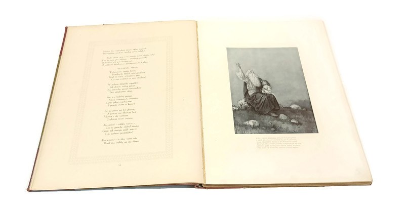 oprawa twarda, szeroki grzbiet i narożniki płócienna, papier na licach, złota miniatura i tłoczenia, s. 106, ilustracje, duży format 37x28,5cm