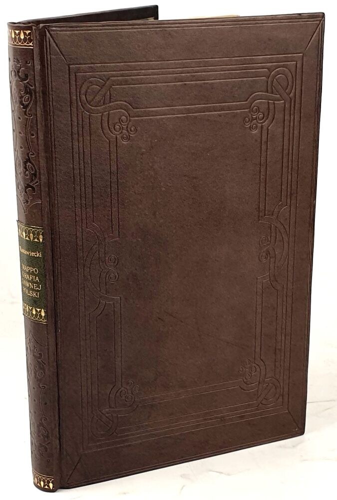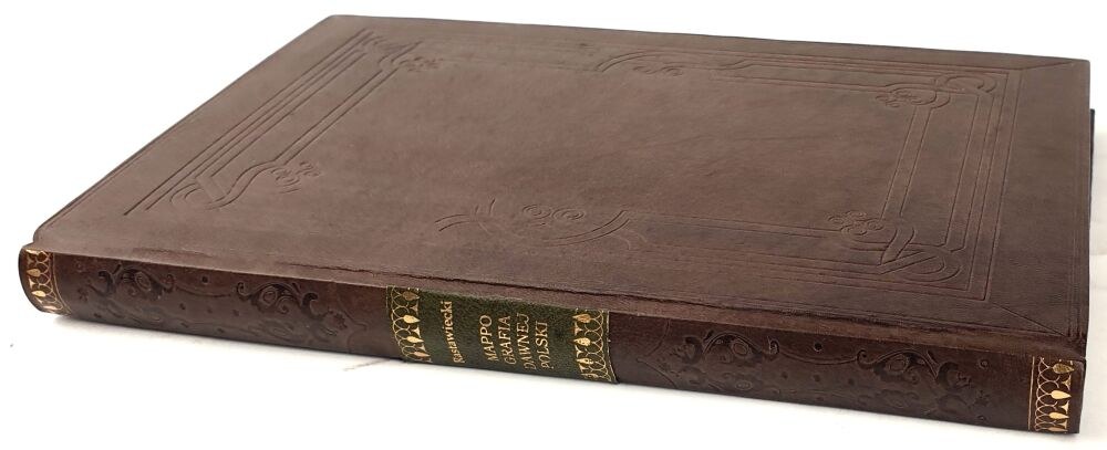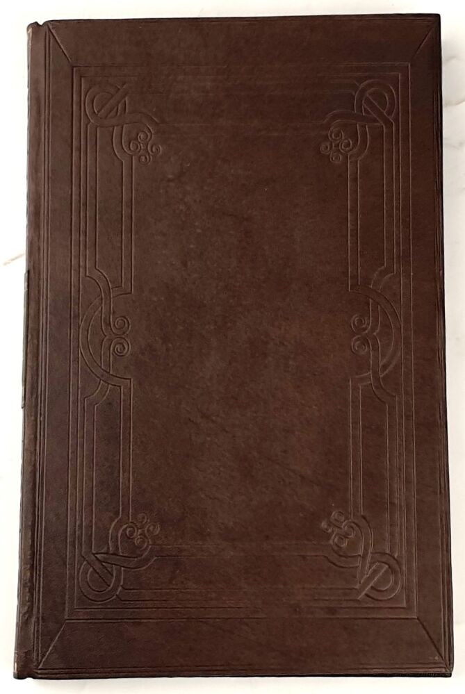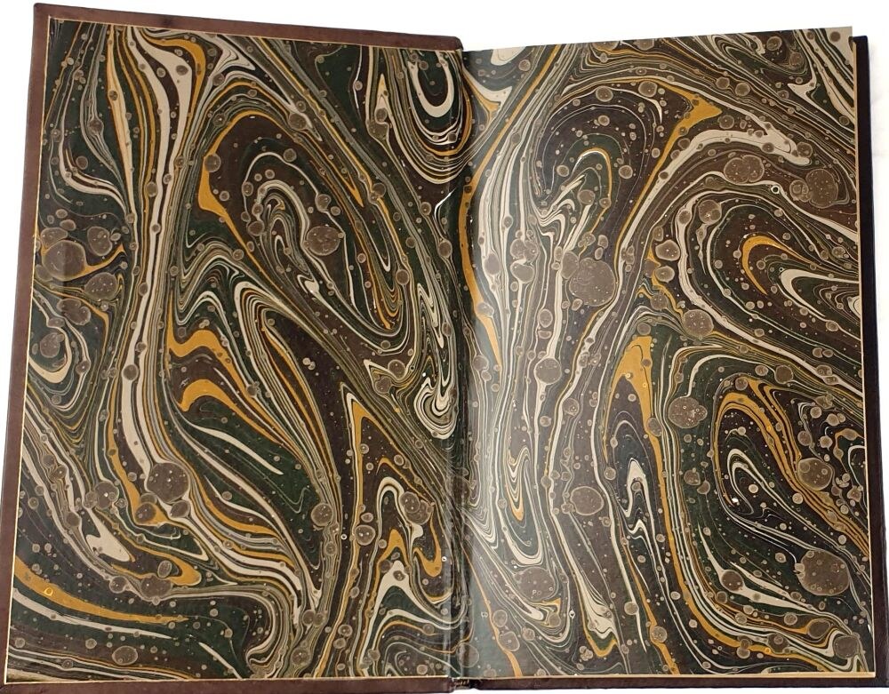 TWARDA OPRAWA PEŁNA SKÓRA WSPÓŁCZESNA STYLIZOWANA NA EPOKĘ, NA KŁADKACH OZDOBNE TŁOCZONE NA ŚLEPO BORDIURY, GRZBIET OZDOBNY, OBCIĘCIA KART ZŁOCONE, RĘCZNIE MARMORYZOWANY PAPIER NA WYKLEJKACH