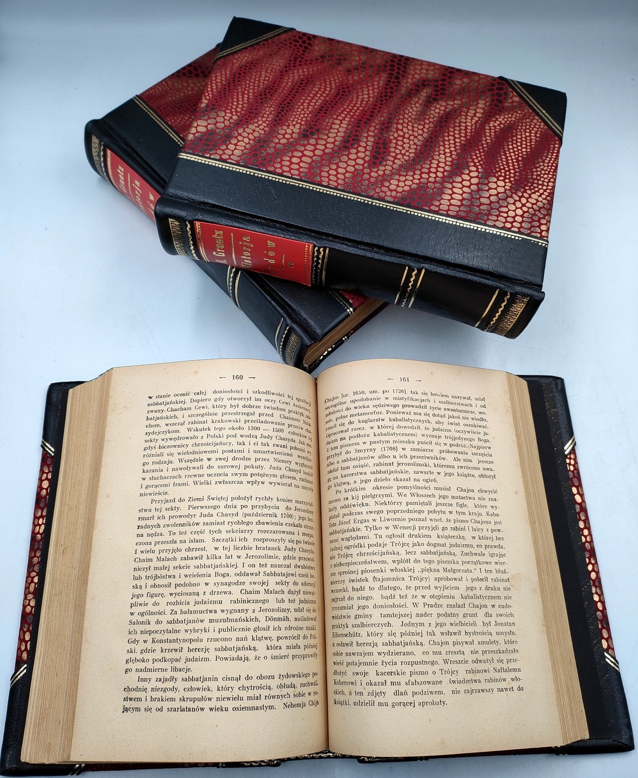 Oprawa twarda. Ciemna skóra z złoceniami oraz bordowe zdobione płótno. Wyklejki ręcznie marmoryzowane.