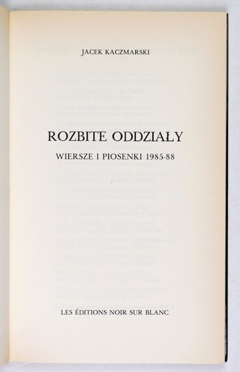 KACZMARSKI Jacek - Rozbite oddziały. Wiersze i piosenki 1985-1988. Montricher 1988. Les Éditions Noir sur Blanc. 8, s. 92, [3]. brosz.