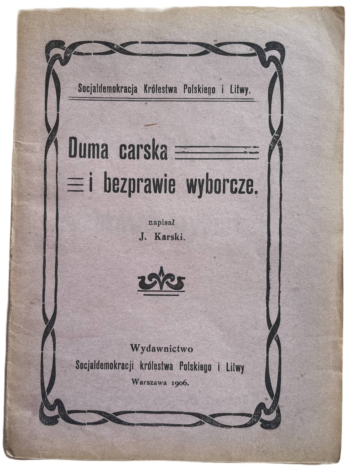 [Marchlewski Julian] Karski J. (pseud.), Duma carska i bezprawie wyborcze. Warszawa 1906, Wyd. Socjaldemokracji Król. Pol. i Litwy. 17 cm, str. 35. Okł. oryg. brosz., stan b. dobry.