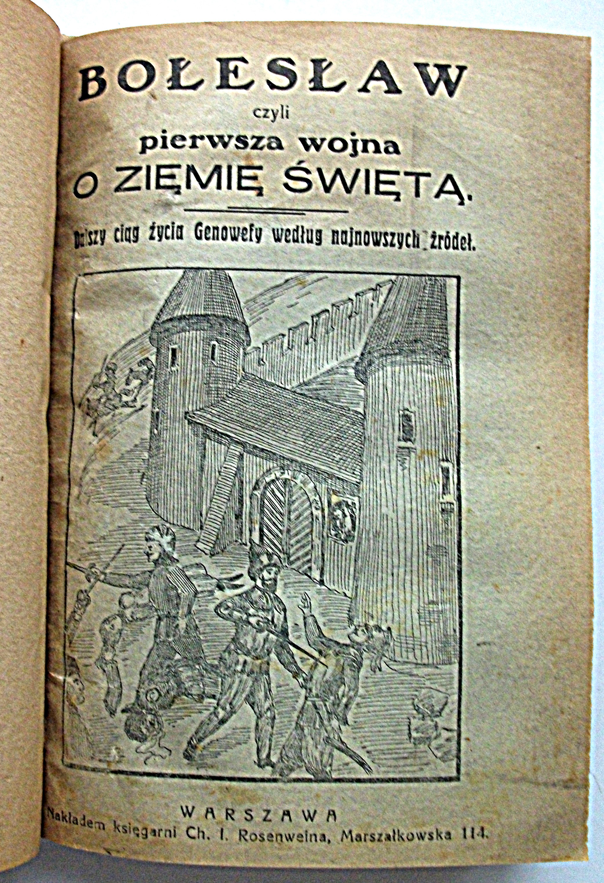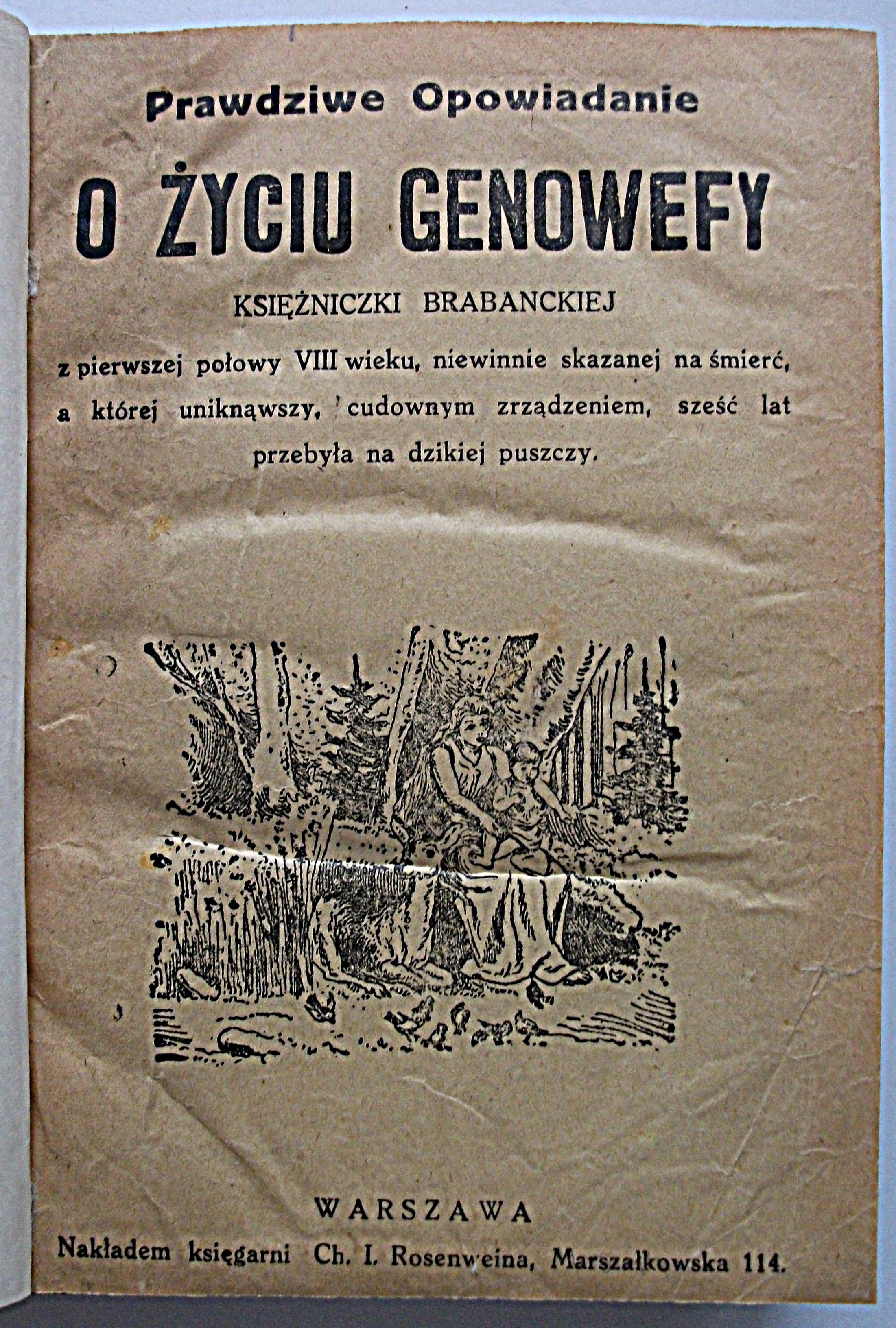 PRAWDZIWE OPOWIADANIE O ŻYCIU GENOWEFY księżniczki Brabanckiej z pierwszej połowy VIII wieku, niewinnie skazanej na śmierć, a której uniknąwszy, cudownym zrządzeniem, sześć lat przebyła na dzikiej puszczy. W-wa [...]. Nakł. Księgarni Ch. I. Rosenweina. Druk. Sikora. Format 14/19 cm. s. 61, 1]. [Dalej]. BOLESŁAW czyli pierwsza wojna o Ziemię Świętą. Dalszy ciąg życia Genowefy według najnowszych źródeł. W-wa [...]. Nakładem jw. Druk. J. Wegmejster. Format jw. s. 64. Współoprawne. Opr. introlig. ppłtn. Okładki oklejone marmoryzowanym papierem. Zachowane oryginalne okładki broszurowe w obu pozycjach. Rzadkie.