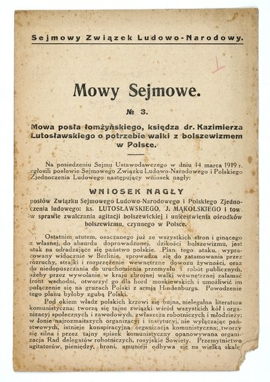 LUTOSŁAWSKI Kazimierz - Mowy Sejmowe. Nr 3. Mowa posła łomżyńskiego, księdza dr. Kazimierza Lutosławskiego o potrzebie walki z bolszewizmem w Polsce. Warszawa [1919]. Drukarnia Literacka. 8, s. 16. brosz. Sejmowy Związek Ludowo-Narodowy.