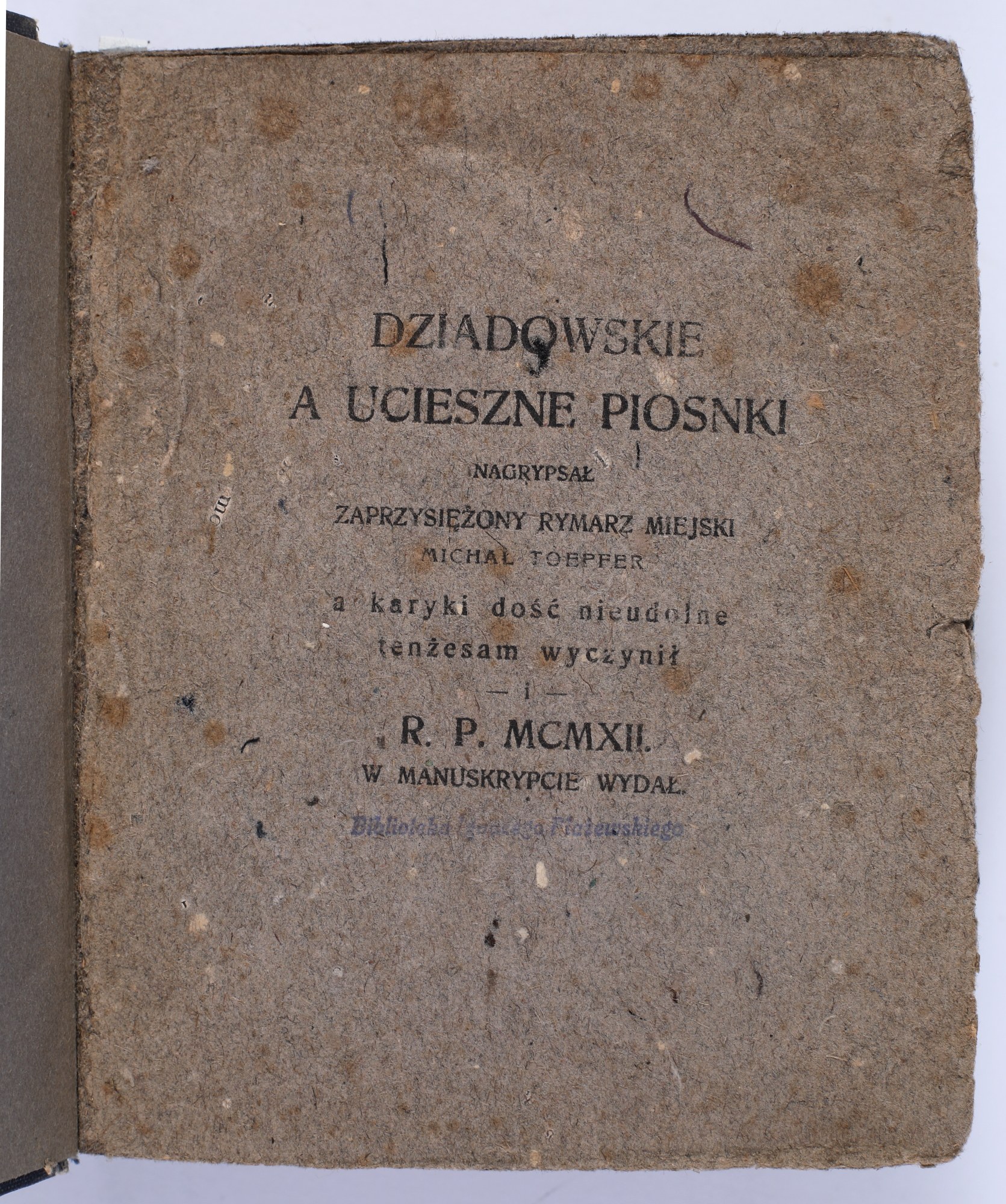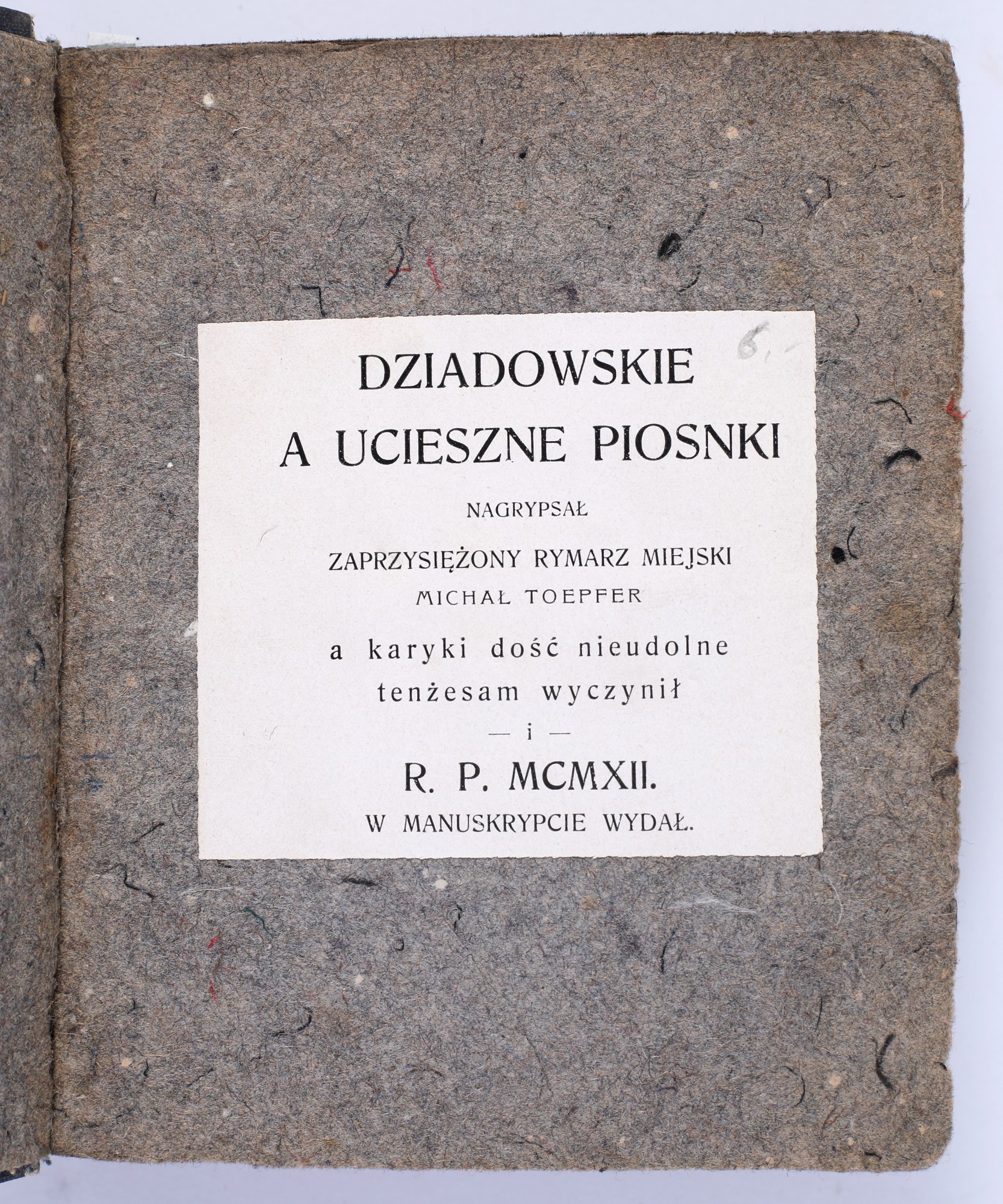 TOEPFER Michał - Dziadowskie a ucieszne piosnki / nagrypsał zaprzysiężony rymarz miejski [...], a karyki dość nieudolnie tenżesam wyczynił i w manuskrypcie wydał. Nakładem Autora. S. I. 1912.