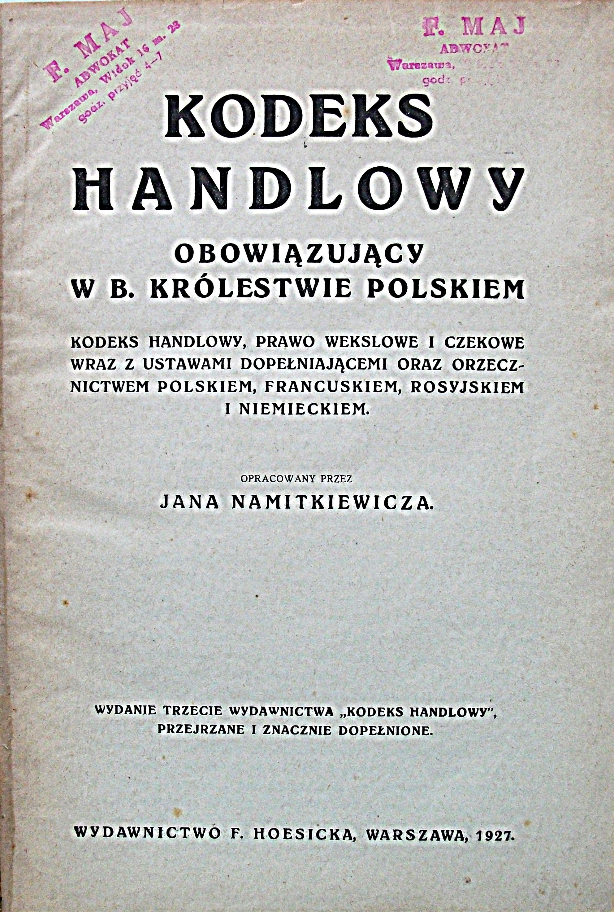 NAMITKIEWICZ JAN - opracowanie. Kodeks Handlowy obowiązujący w B. Królestwie Polskiem. Kodeks handlowy, Prawo wekslowe i czekowe wraz z ustawami dopełniającemi oraz orzecznictwem polskiem, francuskiem, rosyjskiem i niemieckiem. Opracowany przez [...]. Wydanie trzecie wydawnictwa „Kodeks Handlowy”. Przejrzane i znacznie dopełnione. W-wa 1927. Wydawnictwo F. Hoesicka. Druk. Zakł. Graf. B. Wierzbicki i S-ka. Format 16/23 cm. s. 512. [Dalej]. Polskie Prawo Akcyjne. Tekst Rozporządzenia prezydenta RP z dn. 22 Marca 1928 wraz z uzasadnieniem Komisji Kodyfikacyjnej, Skorowidzem Rzeczowym oraz tablicą porównawczą artykułów polskiego prawa i przepisów Kodeksów Handlowych : Niemieckiego, Austrjackiego i Francuskiego. Opracował : Jan Namitkiewicz. W-wa 1928. Wyd. F. Hoesicka. Druk jw. s. 77. Współoprawne. Opr. wyd. płtn., brązowe. Na grzbiecie i licu oprawy złocone napisy. Prywatny stempel własnościowy.