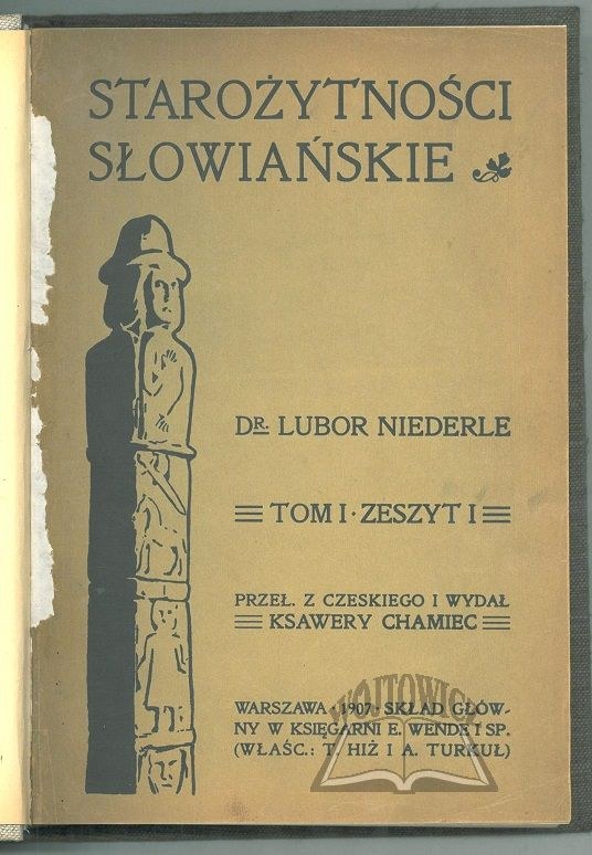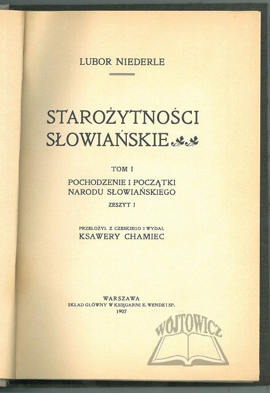 Tom 1, zeszyt I-II: Pochodzenie i początki Narodu Słowiańskiego. Przeł. z czeskiego i wydał Ksawery Chamiec. Warszawa 1907. Skł. Gł. w Księg. E. Wende i Sp. 4, s. XXII, 236, [2], 237-608, II, mapki na osobn. tabl. (w tym 3 skład.), okł. oryg. brosz., opr. pł. wtórna.