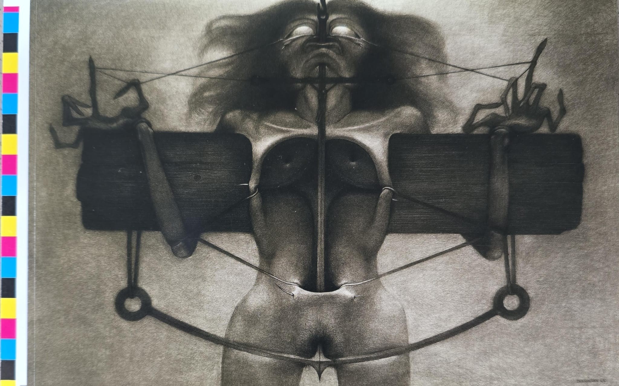 Duża naklejka z reprodukcją rysunku Zdzisława Beksińskiego.