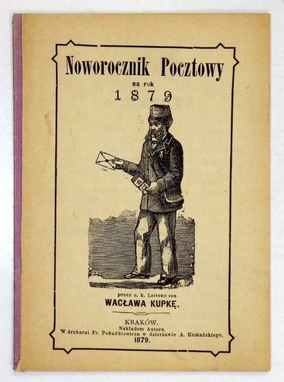 NOWOROCZNIK pocztowy na rok 1879. Przez c.k. listonosza Wacława Kupkę. Kraków 1879. Nakł. autora. Druk. F. Pobudkiewicza w dzierżawie A. Koziańskiego. 16d, s. 9, [2], 5. brosz.