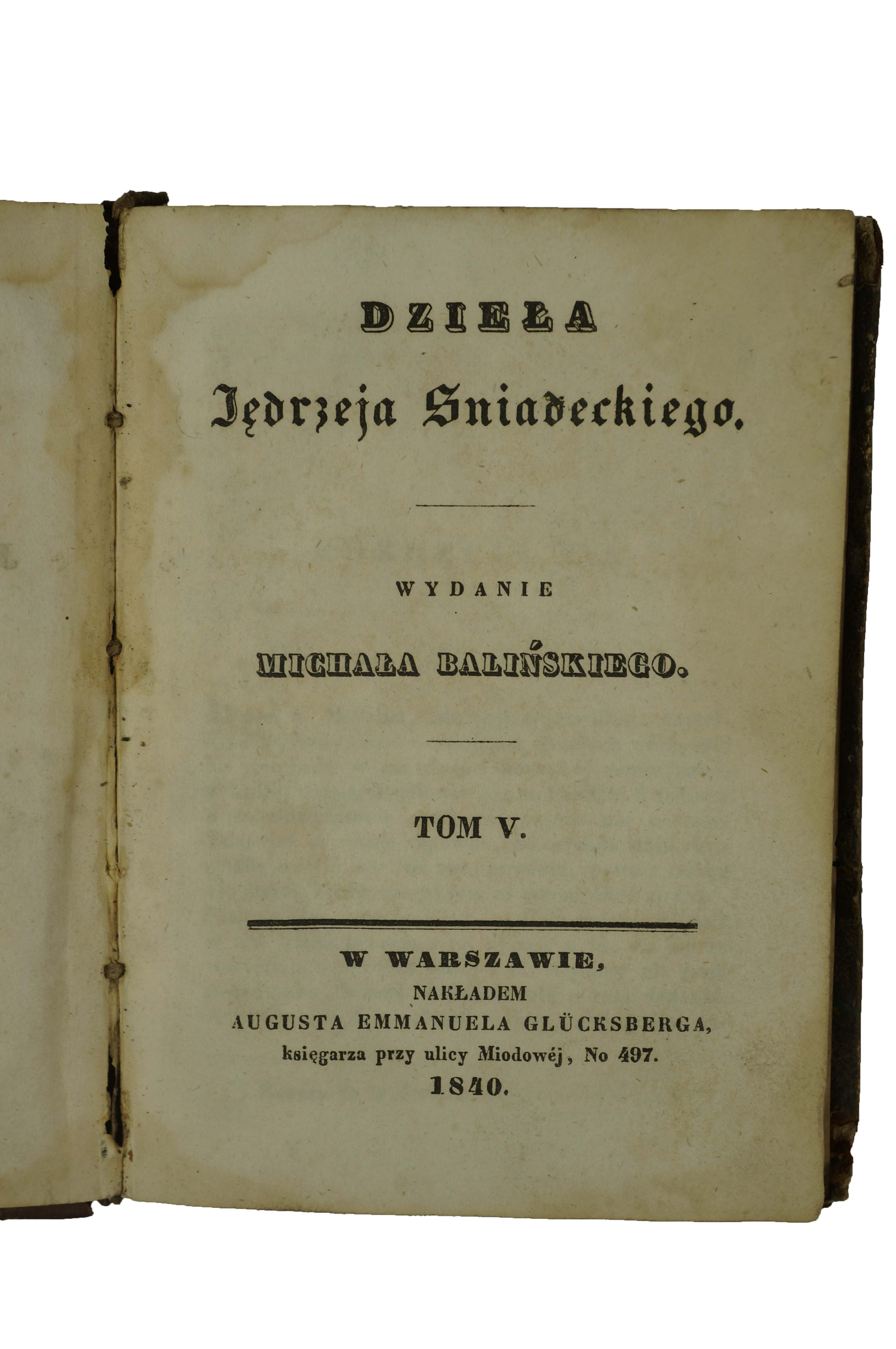 Dzieła Jędrzeja Śniadeckiego , tom V, w Warszawie Aug. Emanuel Glücksberg, Warszawa 1840r., f. 10,5x15cm, s. 161, [1]