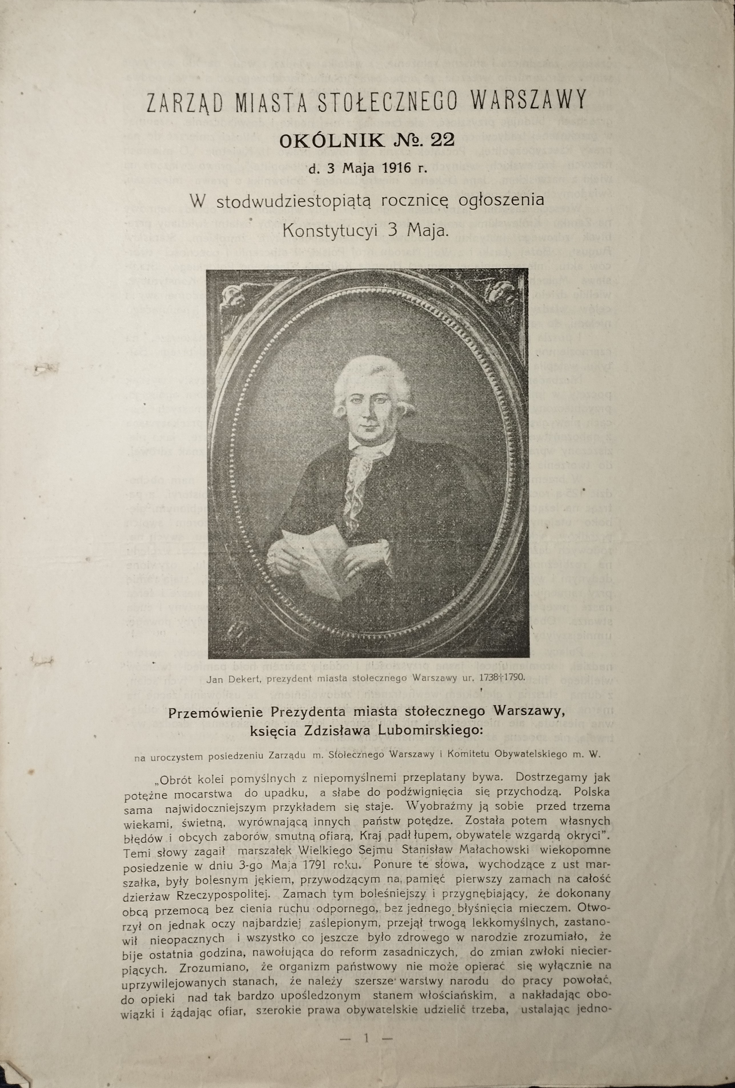 Zarząd Miasta Stołecznego Warszawy, okólnik nr 22. 4 s. 7. Stan dobry. Zawiera m.in.: Przemówienie Prezydenta miasta stołecznego Warszawy; Prawo o miastach z dn. 18 kwietnia 1791 r.; i in.