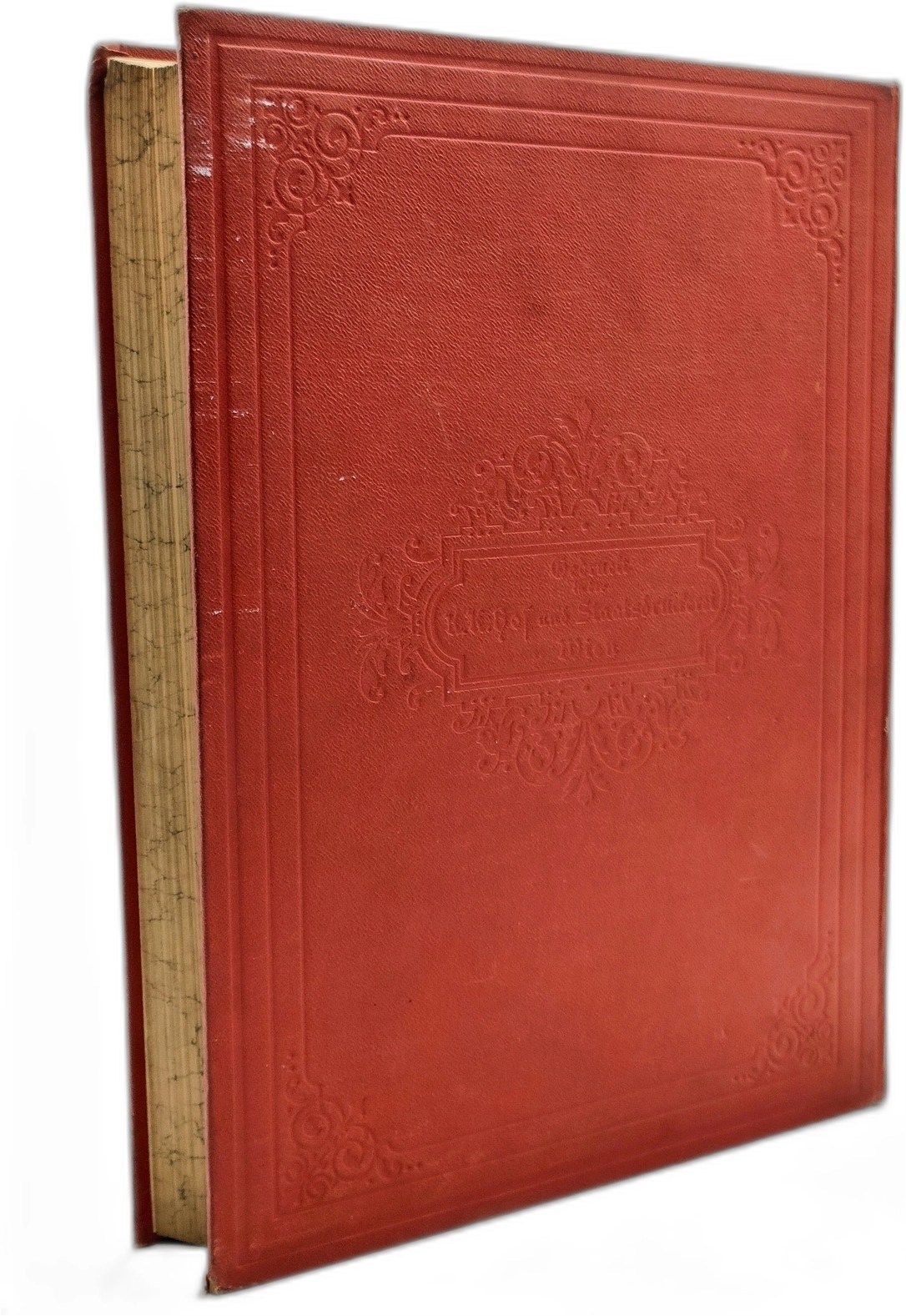 Oprawa twarda artystyczna, czerwone płótno z licznymi tłoczeniami, herbami i ozdobnikami na okładce tylnej tłoczenie Gedruckt KK Hof- und Staatsdruckerei Wien.