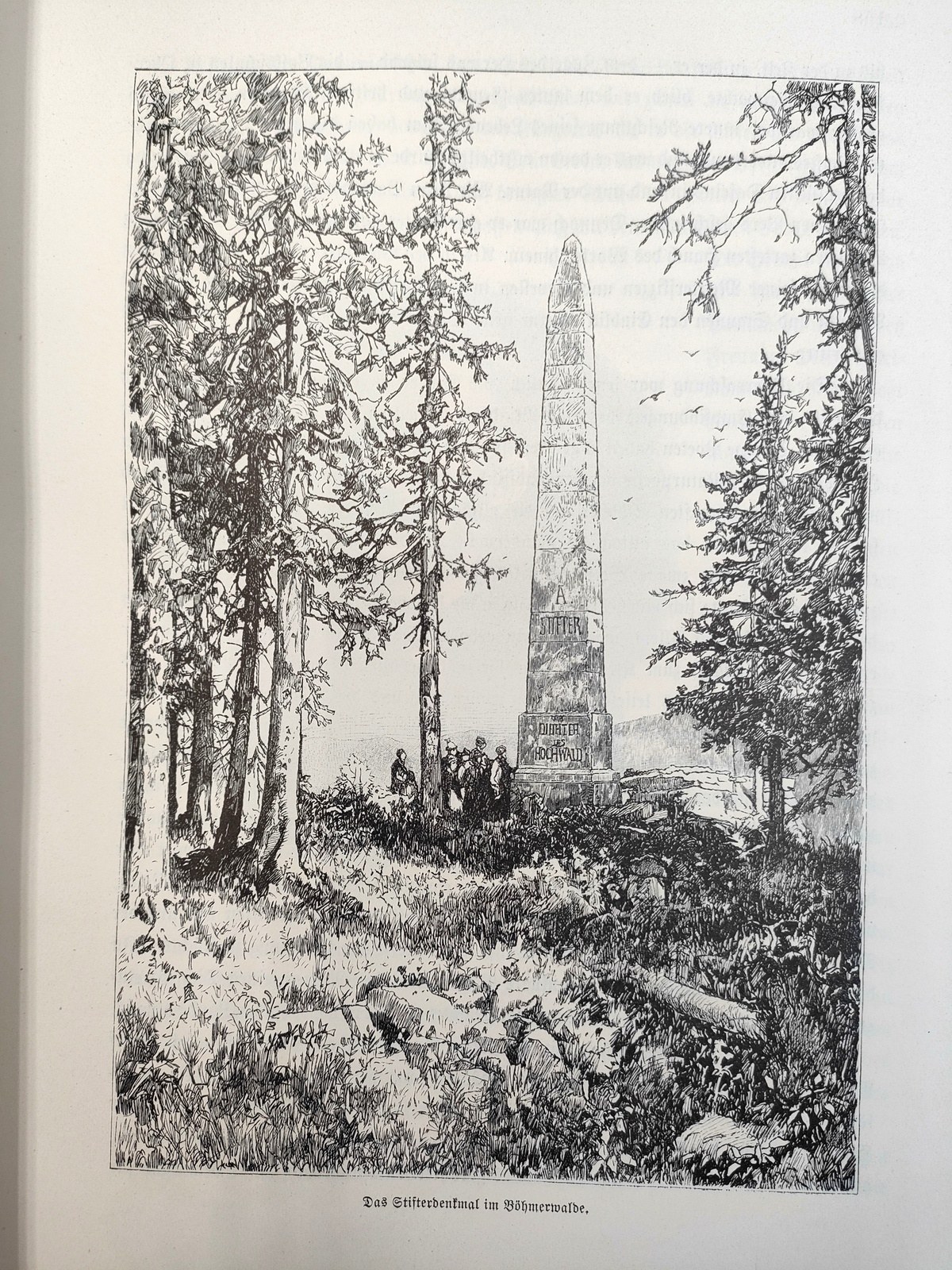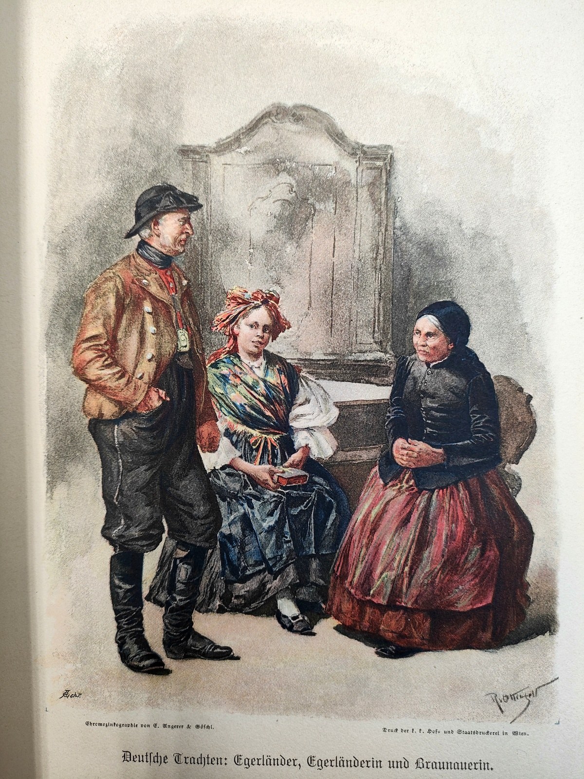 Blok spójny, karty czyste, pieczęć Volksschule für Mädchen , Teschen - ( szkoły dla dziewcząt w Cieszynie). Brzegi kart marmoryzowane, liczne całostronicowe ilustracje, ryciny i reprodukcje obrazów największych artystów Monarchii, portrety i biografie wybitnych ludzi, opisy architektoniczne zabytków, tematy dotyczące kultury i sztuki danego regionu.