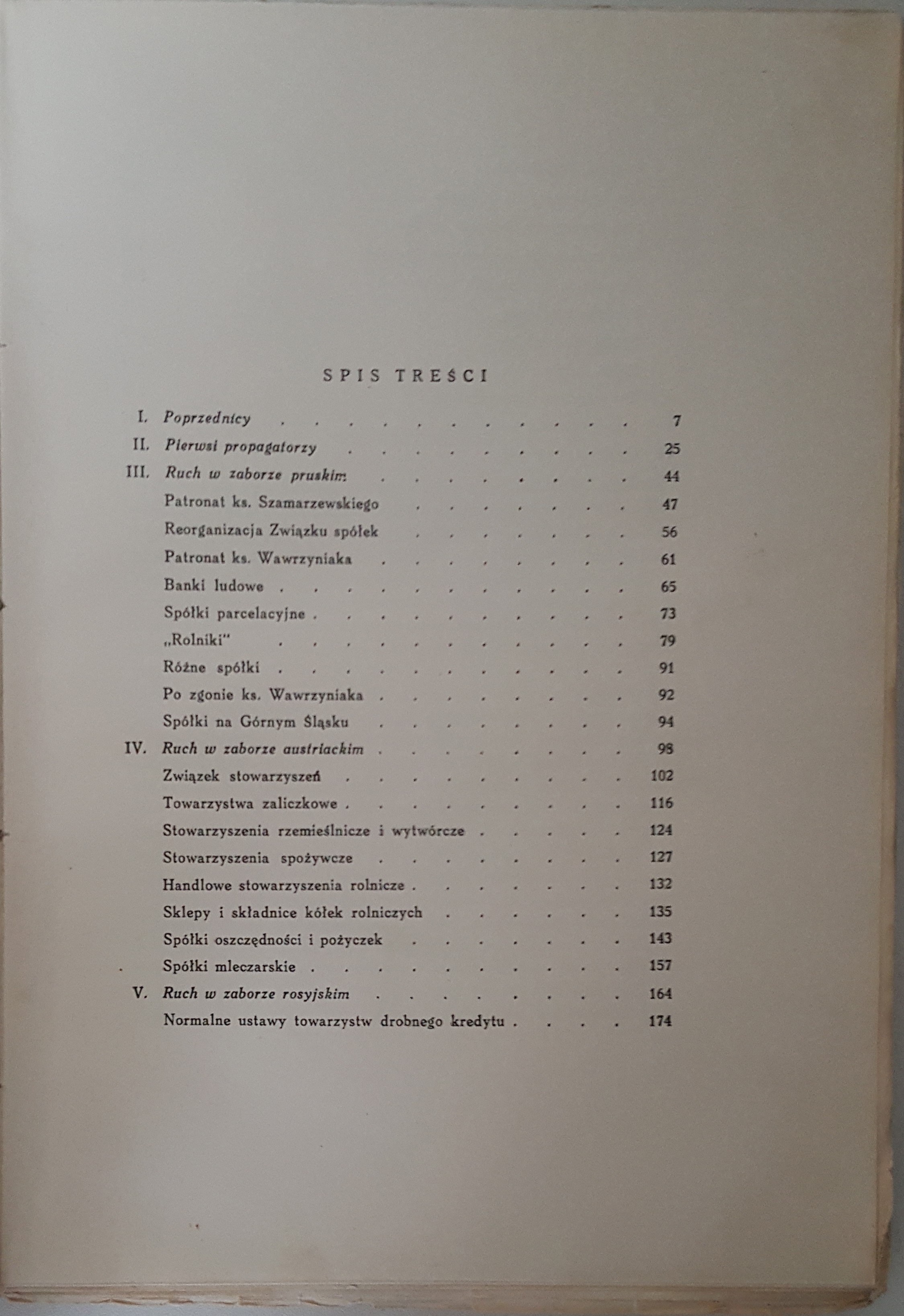 Zawiera: I: Poprzednicy; II: Pierwsi propagatorzy; III: Ruch w zaborze pruskim; IV: Ruch w zaborze austriackim; V: Ruch w zaborze rosyjskim; VI: Ogólne zestawienie.