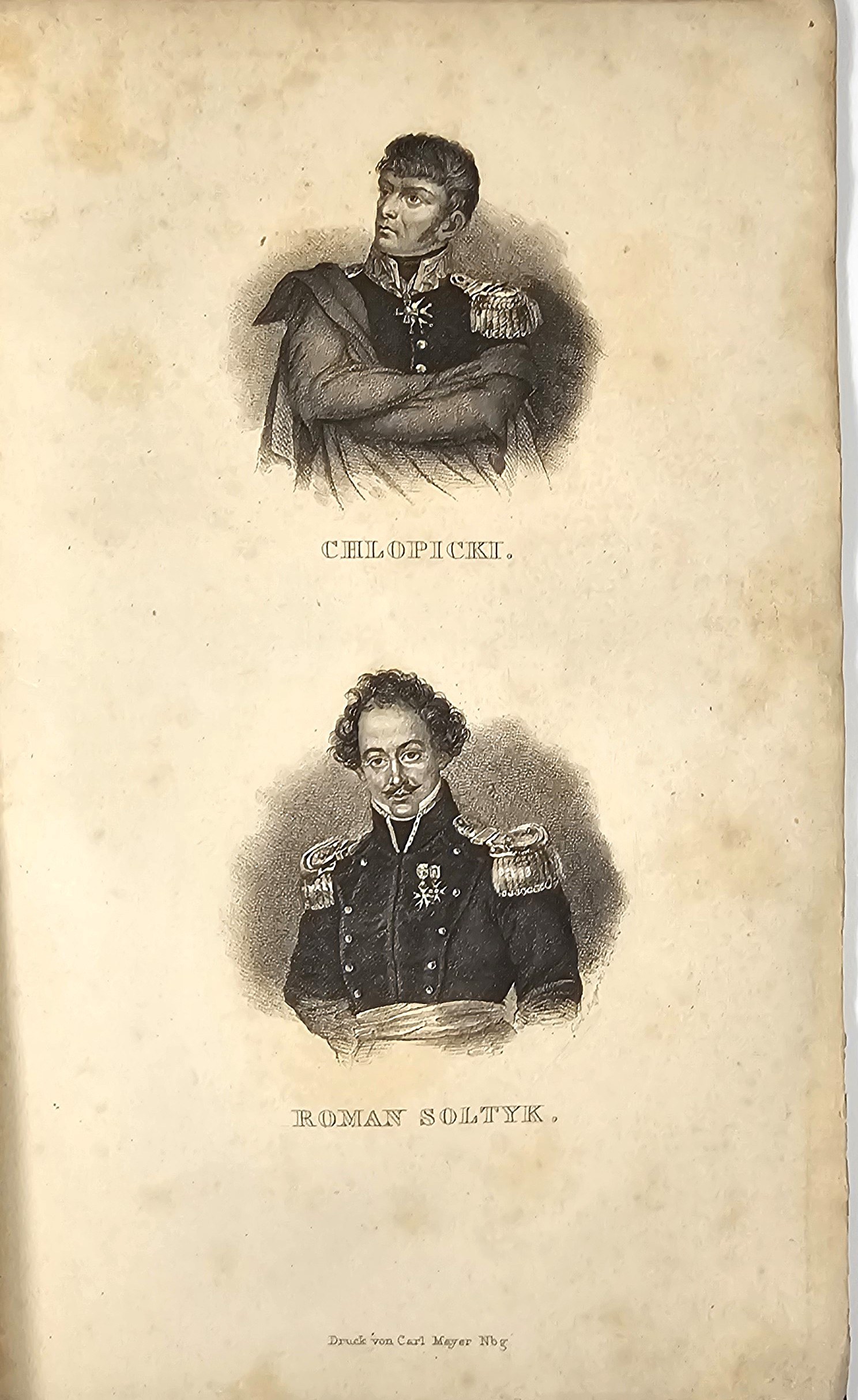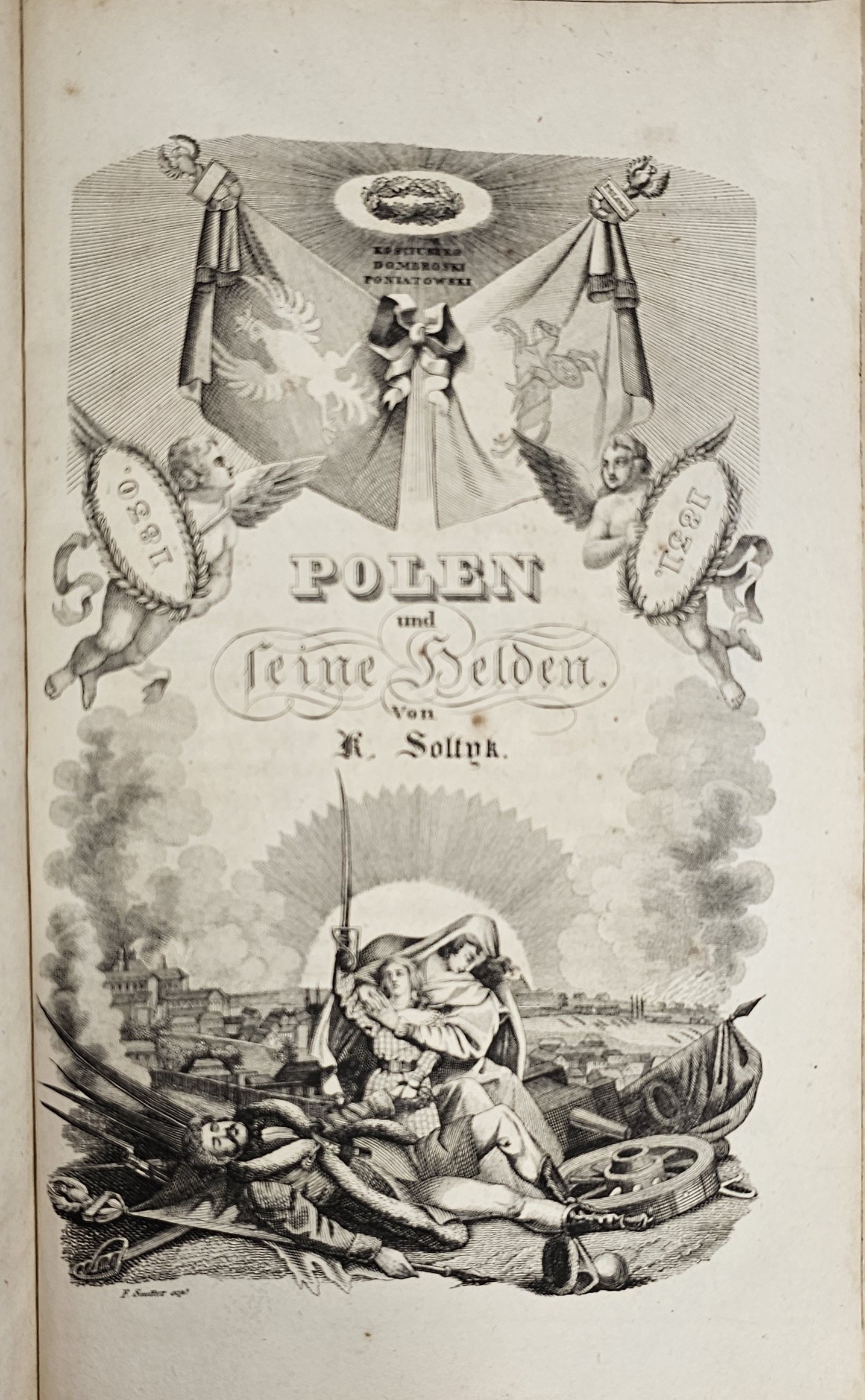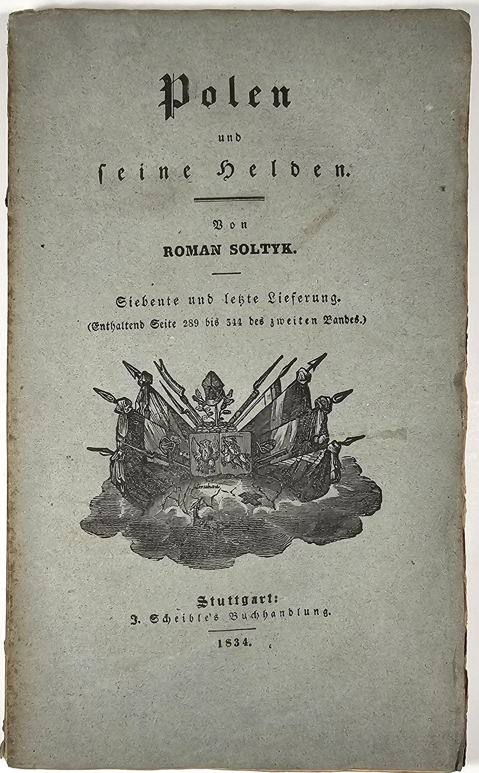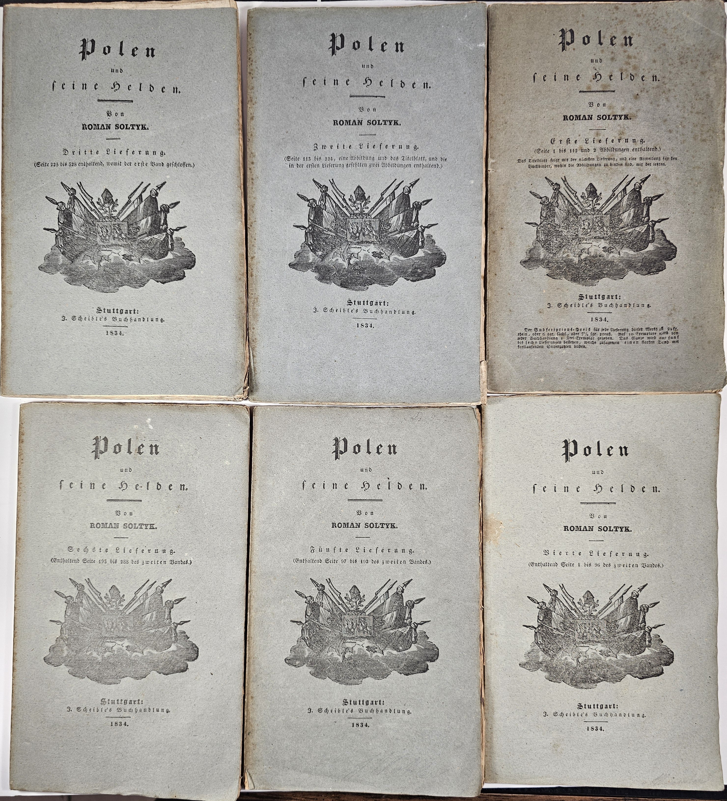 Tłum. z j. franc. oraz uzupełnił krótkimi notatkami geograficzno-statystycznymi o Polsce i jej mieszkańcach Heinrich Elsner. 21.5 cm, s. 112; 113-224, 4 tab. miedzioryty: w tym k. tytuł.; [1], 225-328; 96; 97-192; 193-288; [1], 289-344, 8 tab. miedzioryty, Siedem zeszytów: okładki oryg. wydawnicze, każda opatrzona winietą. Z. 1 z rdzawymi plamkami na okł., pozostałe okładki czyste. Strony w poszczególnych częściach miejscami zabrązowione mimo to stan bardzo dobry. Rzadko spotykany na rynku antykwarycznym przykład zeszytowego wydania Historii Polski okresu powstania listopadowego Sołtyka przeznaczony do oprawy.