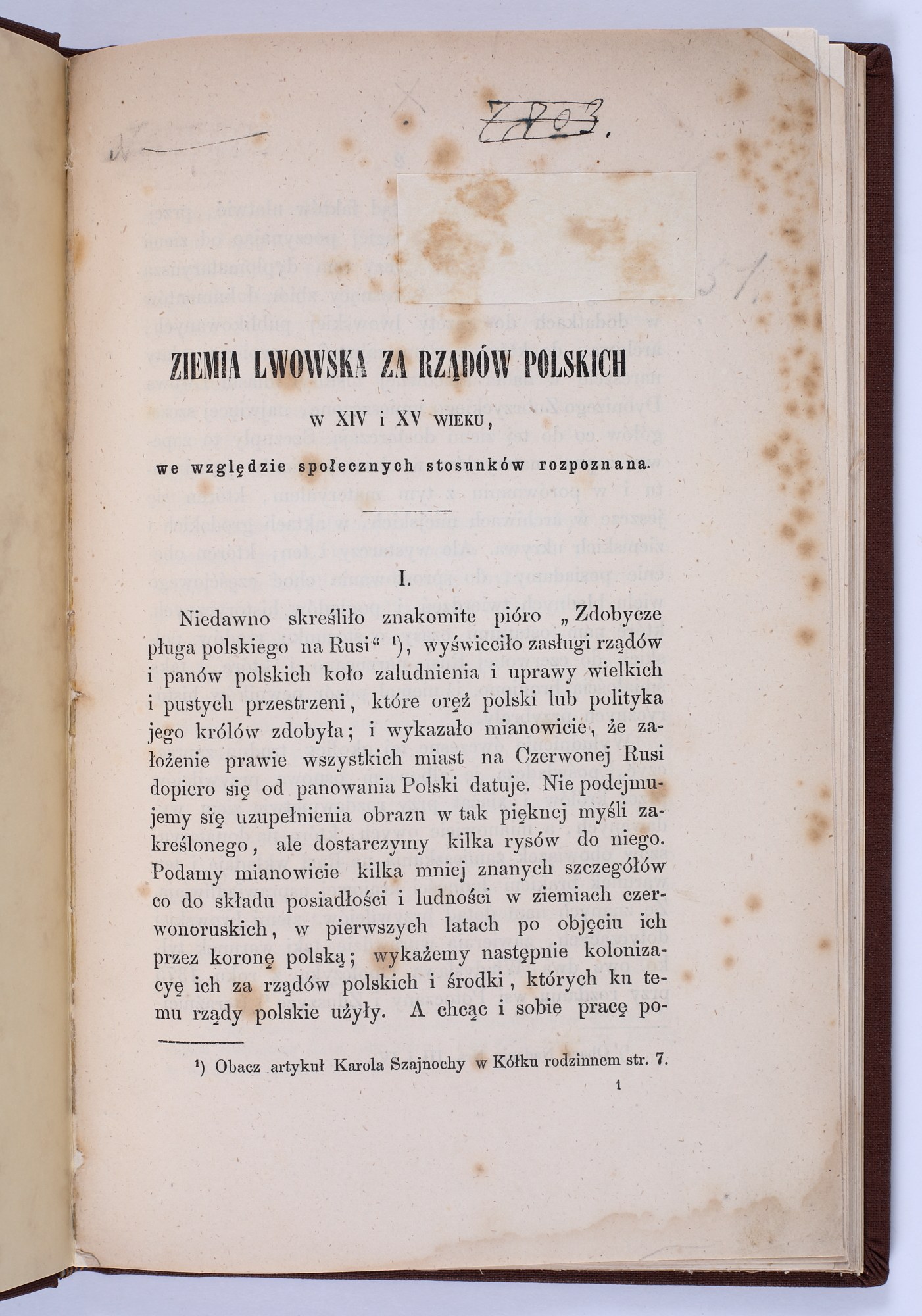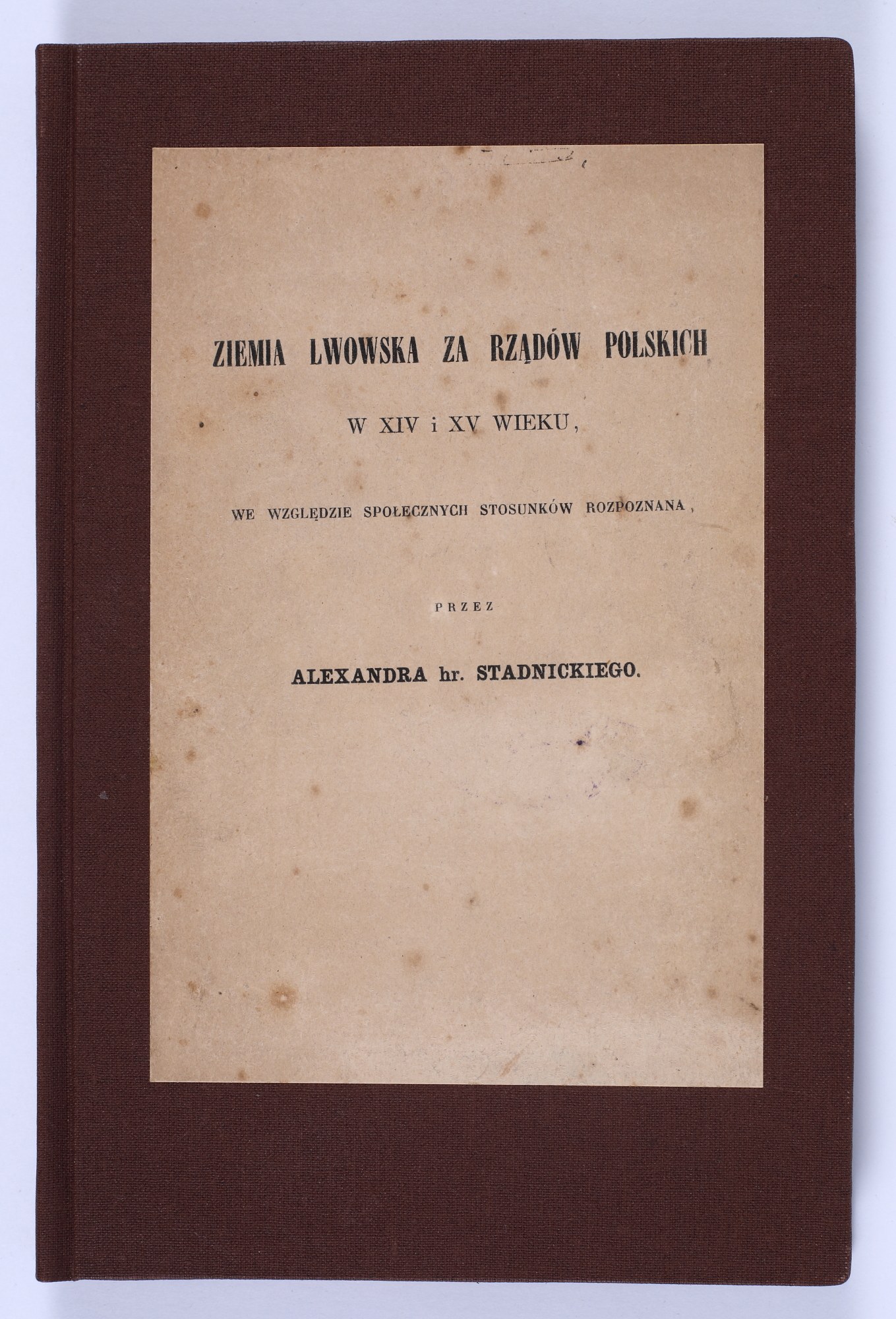STADNICKI hr. Aleksander - Ziemia lwowska za rządów polskich w XIV i XV wieku we względzie społecznych stosunków rozpoznana [Lwów 1863]. Druk. Zakł. im. Ossolińskich