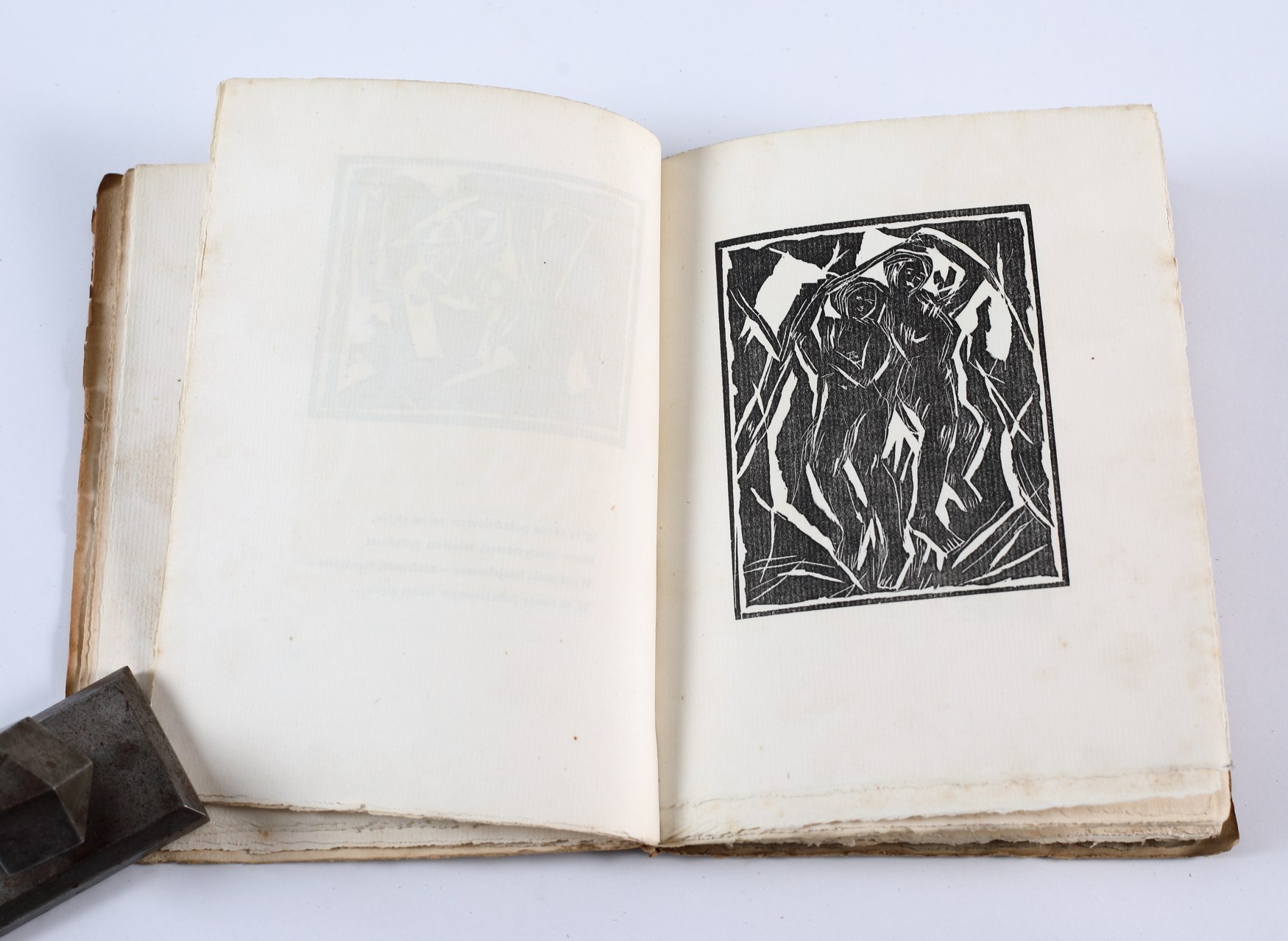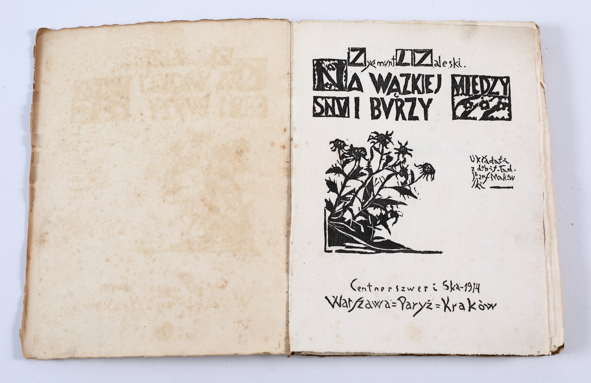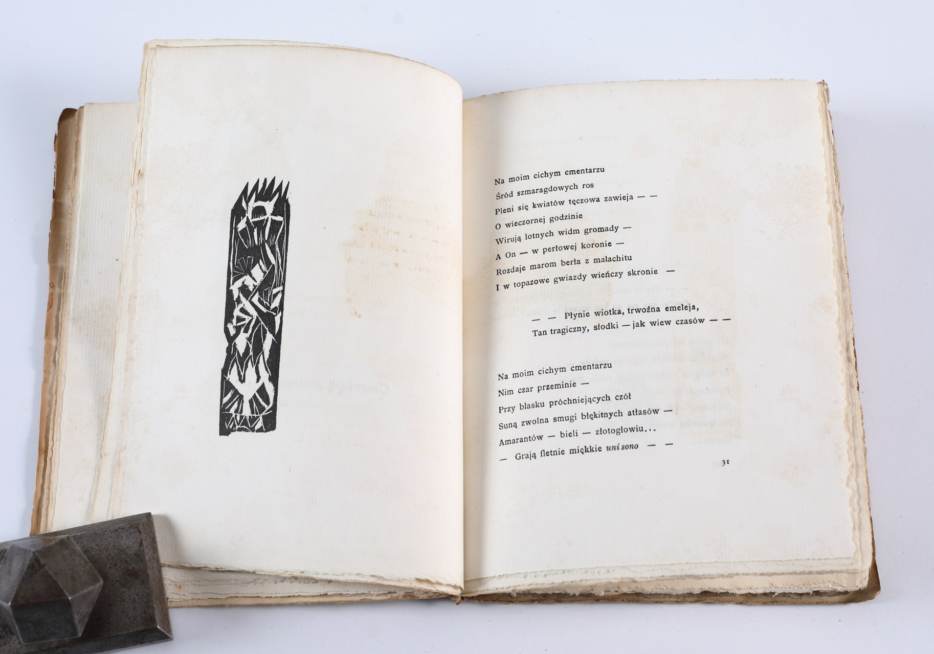 Zabrudzenia okładki. Gdzieniegdzie foxing. Poza tym stan dobry. Egz. num. 9. Z podpisem autora. Książka ilustrowana przez Tadeusza Makowskiego w duchu kubizmu, ilustracje odbite w drzeworycie.