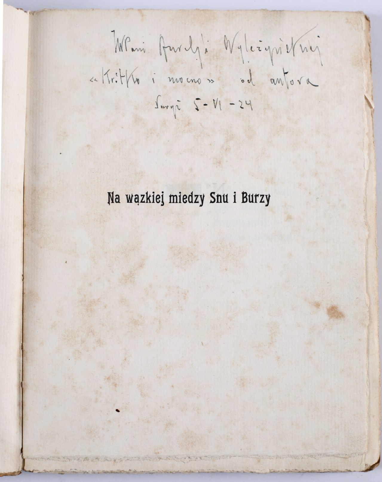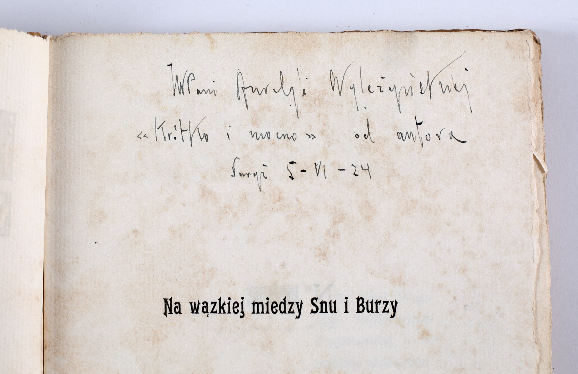 Dedykacja autora dla Aurelii Wyleżyńskiej (1881-1944), polskiej pisarki i publicystki, żony Jana Parandowskiego. Dedykacja o treści: "JWPani Aurelji Wyleżyńskiej <