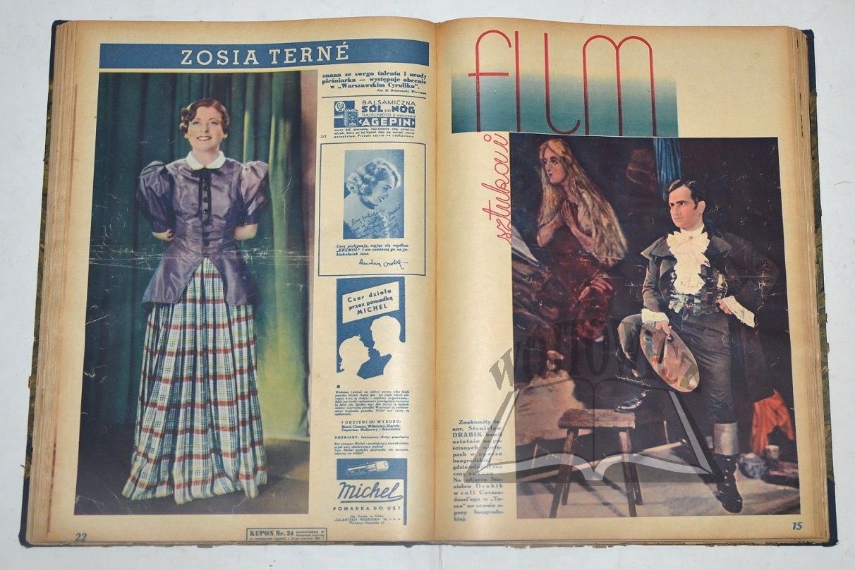 Dodatki nie posiadają daty ani numeracji. Każdy dodatek od 15 str. do 22 str. (lub więcej). Folio, liczne ilustr., opr. ppł. z epoki. Stan dobry. Otarcia i niew. naddarcia opr. Zażółcenia, miejscami naddarcia i zaplam., podklejenia kart. Na kilku kartach brązowe plamki. Zawiera: sceny z filmu, recenzje, sylwetki, teatr, moda, muzyka, sztuka, wywiady, wypowiedzi i inne. 9719/130