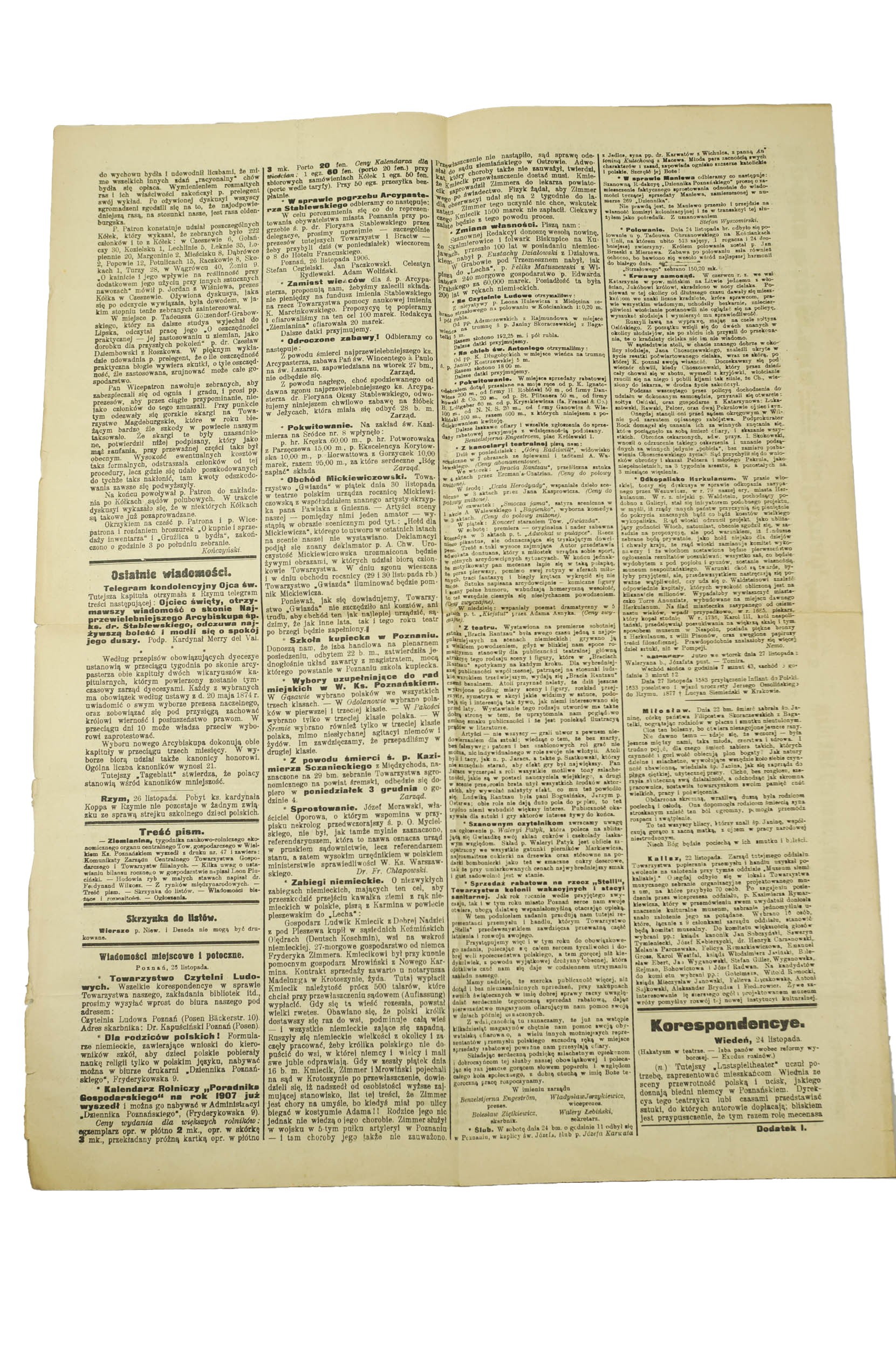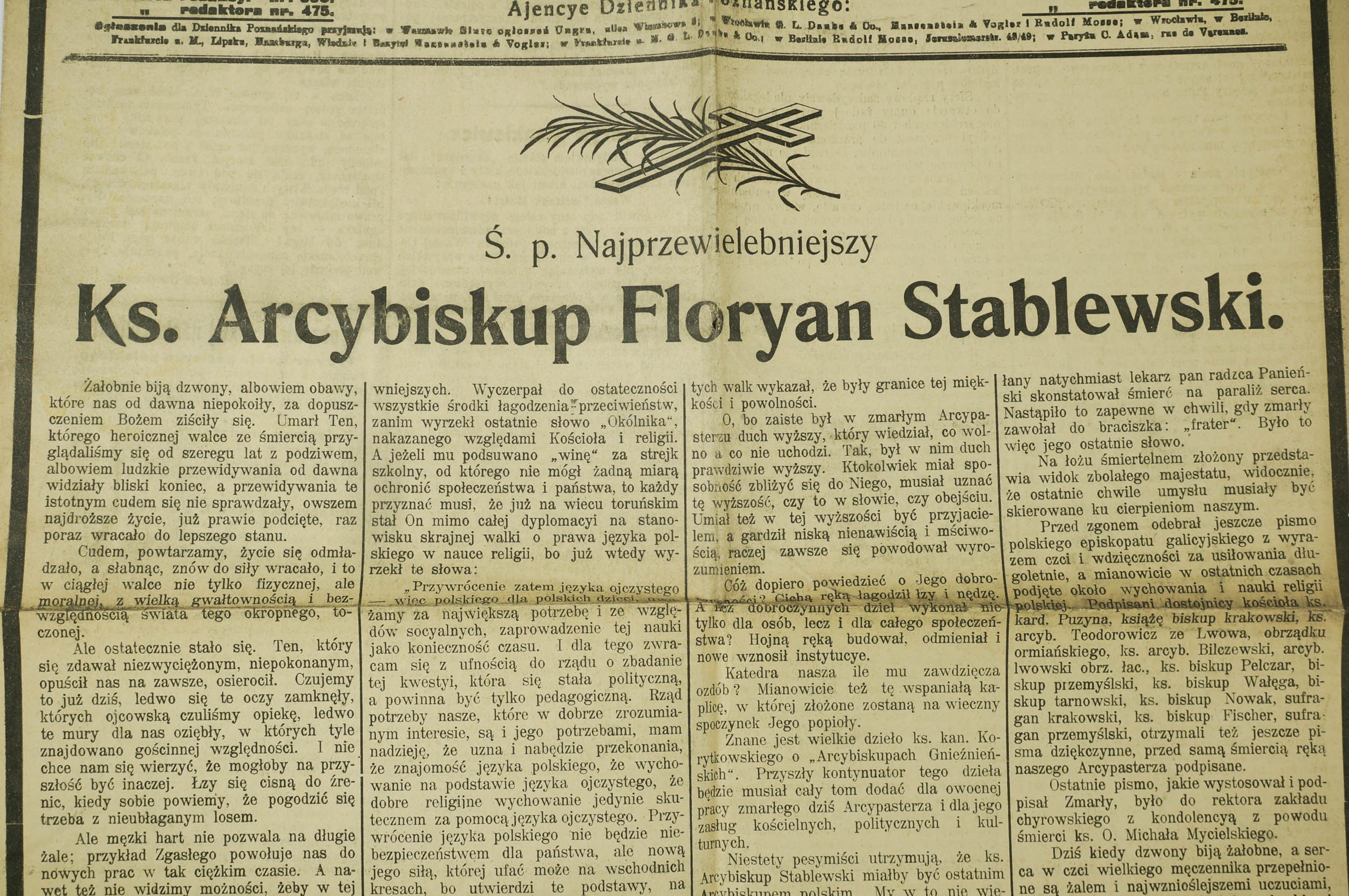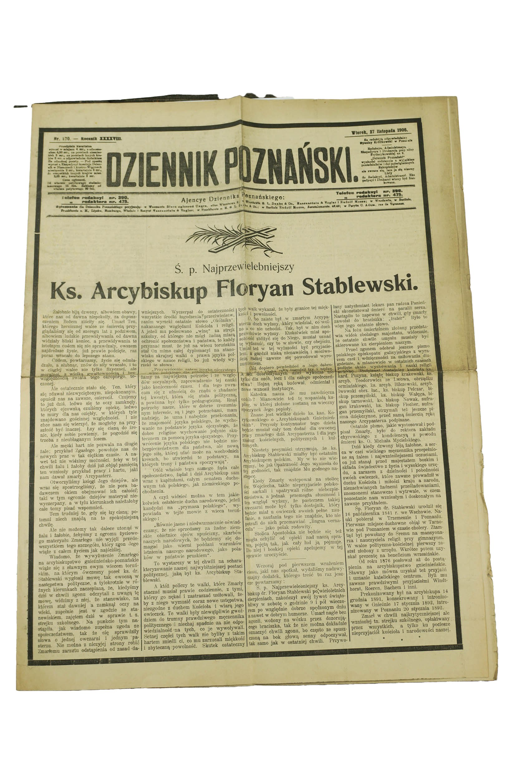 DZIENNIK POZNAŃSKI z dnia 27 listopada 1906r. , pierwsza strona poświęcona zgonowi prymasa Polski, arcybiskupa Floriana Stablewskiego, f. 39,5 x 53cm, s. 4